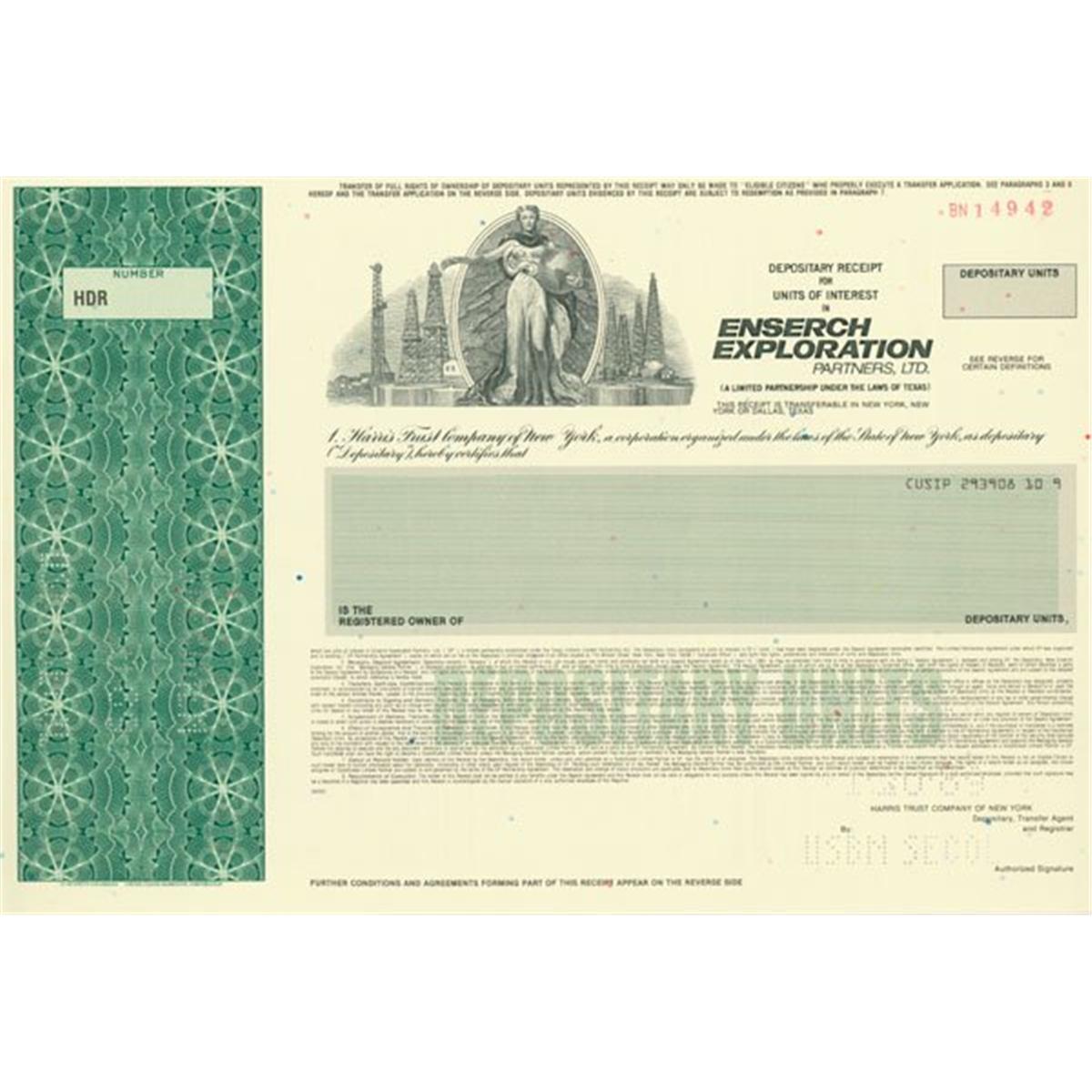 1989, Texas. SPECIMEN deposit receipt of units of interest. Green/Black. Vignette of an allegorical female holding a globe, flanked by oil derricks. Perforation cancelled and Excellent.