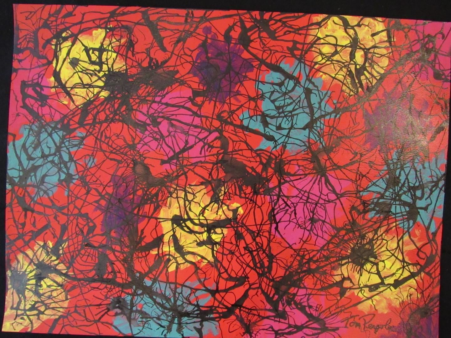 A colorful abstract acrylic painting by California artist Tom Pergola. 18x24" on irregular acid-free art paper, with COA.