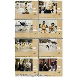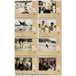 <B>Enter the Dragon (Warner Brothers, 1973)</B></I> Lobby Card Set of 8 (11" X 14"). Perhaps the greatest of all kung fu films, "Enter the Dragon" was the high point of Bruce Lee's career. Unfortunately, he died three weeks before the film was released. Very slight wrinkles, a light smudge and very small corner crease on one card, a small edge tear in one card, and a rating stamp on all but two cards. Otherwise, these are very clean cards, with great martial arts action on most of them. Near Mint-. 8 items