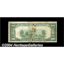 Enterprise, AL - $20 1929 Ty. 1 The First NB Ch. # 6319The Kelly tome reports only 3 Small for this bank, with this $20 being infiltrated by rust through the portrait area. Very Fine, rust. <BR><BR><B>Important notice:</B> Heritage usually auctions material at the rate of 200-250 lots per hour. On some occasions eBay Live bid software or the Internet may not be able to keep up with the pace of the auction. We recommend placing a realistic absentee bid now as insurance to avoid disappointment. Occasionally the auctioneer may eliminate or reject an eBay Live bid, and the auctioneer may also reopen a lot after the close of the eBay live bidding (usually because we missed an audience bid), and may reject your bid even if it shows you as the winning bidder. By bidding via eBay Live, you agree that Heritage may award the lot to another bidder at its sole discretion under the circumstances described above or any other reasonable circumstances. Since eBay bids are not shown to us until we open the lot on the floor, we treat those bids just like floor bids. In most cases the floor responds before the eBay bid is presented to us, due to Internet lag time, so for consistency we have made it a policy that floor bids are always considered first over tie eBay live bids. Also please note that all Heritage lots purchased through eBay Live carry a 20% Buyer's Premium. Please make sure you read the Terms and Conditions before you bid. <BR><BR><B>IMPORTANT ANNOUNCEMENT ABOUT RESERVES:</B> Heritage now divulges all reserves on its web site 7 days before every auction. If you want to know whether the reserve on this lot has been met, and if not, what the reserve amount is, please visit this lot page on the HeritageCoin.com web site, or email: bid@HeritageGalleries.com