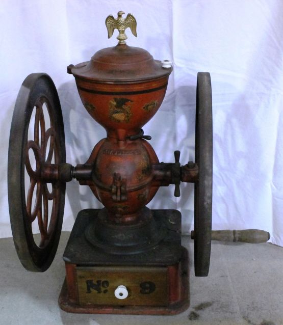 Nice original paint. Minor crack on bottom of frame. Two 19 1/2" fly wheels, 28" tall to top of eagle.