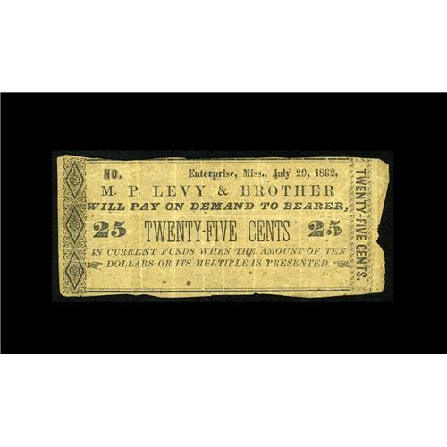Enterprise, MS- M.P. Levy & Brother 25¢ July 29, 1862 L Enterprise, MS- M.P. Levy & Brother