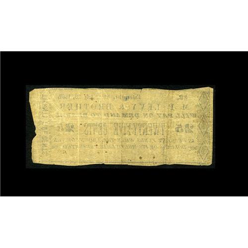 <B>Enterprise, MS- M.P. Levy & Brother</B></I> 25¢ July 29, 1862 Leggett UNL<BR>An exceptionally rare note, with Leggett listing only a $1 example from here. We sold this note about six years ago and have seen nothing from this issuer since. <B>Fine-Very Fine.</B></I>