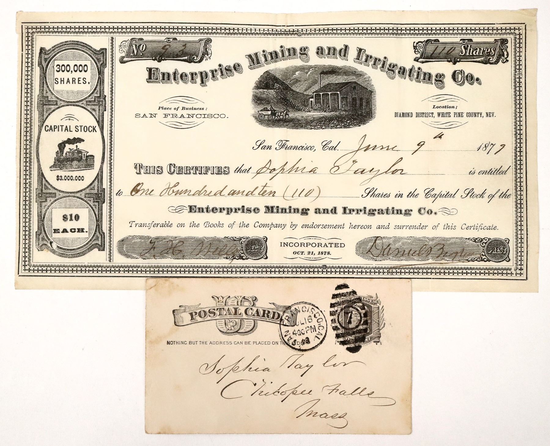 Rare issued 1877 Enterprise Mining and Irrigating stock. Also includes 2 small letterhead section referencing company officers and a stock purchase. Located in Diamond district. Elevation of 8,399 feet.