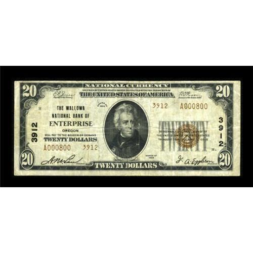 <B>Enterprise, OR</B></I> - $20 1929 Ty. 2 <B>The Wallowa NB</B></I> Ch. # 3912<BR> A tough note from this small town in the far northeastern corner of the state. Nice <B>Fine-Very Fine.<BR></B></I><BR><BR><b>Shipping:</b> Coins & Currency (<a target="_blank" href="http://www.heritageauctions.com/common/shipping.php">view shipping information</a>)