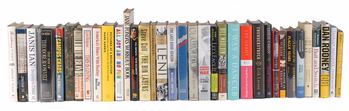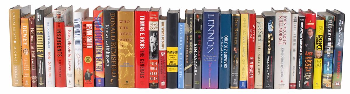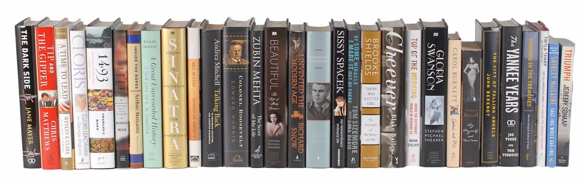 Diverse collection of one hundred books, almost all hardcover, each signed by the associated celebrity, including: Lauren Bacall, Peter Bogdanovich, Bill Bradley, Carol Burnett, Leslie Caron, Wesley K. Clark, Joan Didion, Kirk Douglas, Phil Esposito, Dale Evans, Jane Fonda, Al Franken, Ben Gazzara, Lee Grant, Janis Ian, Walter Isaacson, Wynonna Judd, Sebastian Junger, Cloris Leachman, Shirley MacLaine, Howie Mandel, Zubin Mehta, Arthur Mercante, Bill Moyers, Willie Randolph, Dan Rather, Ron Reagan, Lynn Redgrave, Pat Robertson, Donald Rumsfeld, Brooke Shields, Tom Sizemore, Kevin Smith, Sissy Spacek, Twyla Tharp, Joe Torre, and Serena Williams. In overall fine condition. A complete list is available online at RRAuction.com.