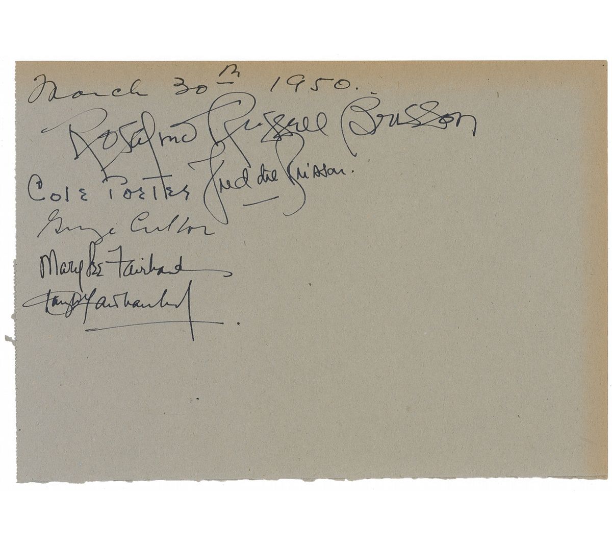 Six bold ink signatures, “George Cukor,” “Cole Porter,” “Douglas Fairbanks,” “Mary Lee Fairbanks,” “Freddie Brisson,” and “Rosalind Russell Brisson,” dated March 30th, 1950, in another hand on a 10.75 x 14 beige sheet. A central horizontal fold, toning along the edges, and a sizeable area of paper loss to the bottom left corner, otherwise fine condition.