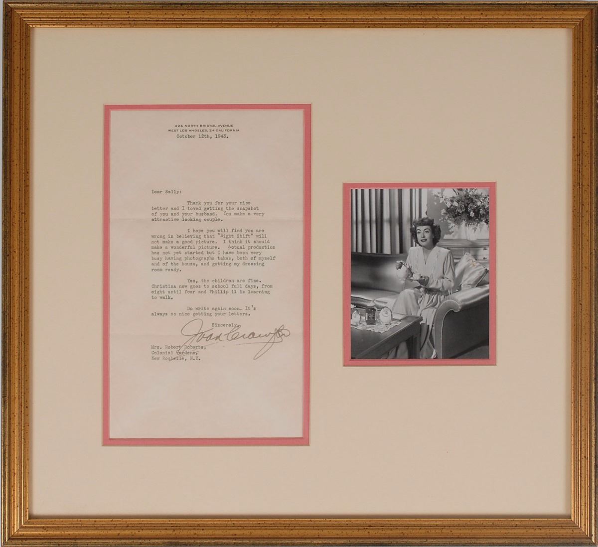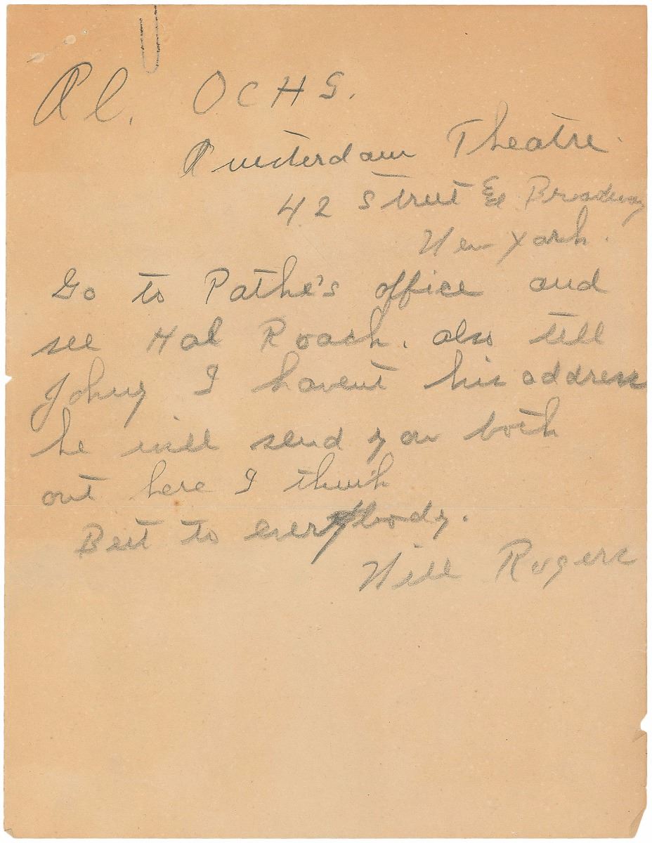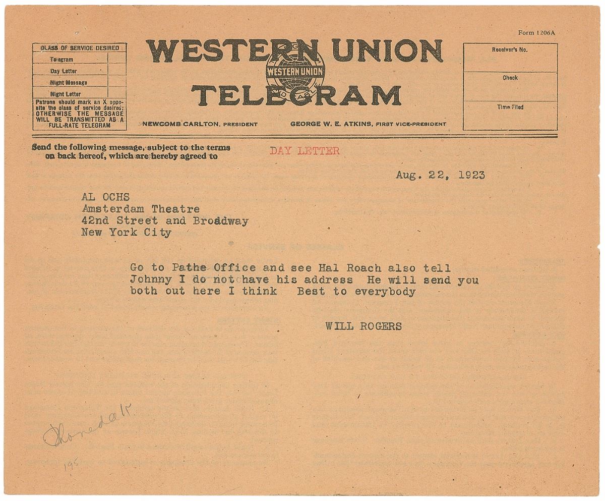 In overall very good to fine condition. Accompanied by an unsigned Western Union telegram for the Rogers letter, dated August 22, 1923, as well as the original mailing envelope for the Crawford letter.