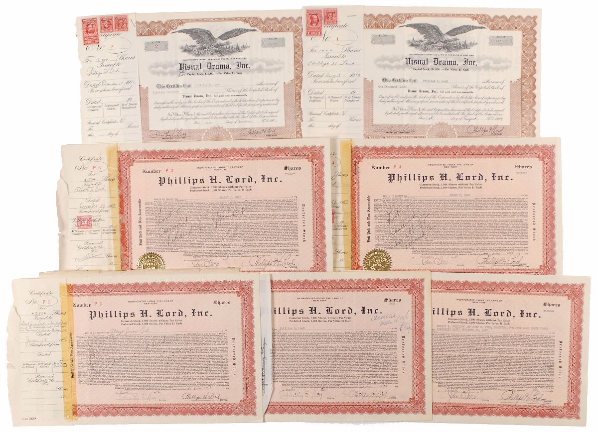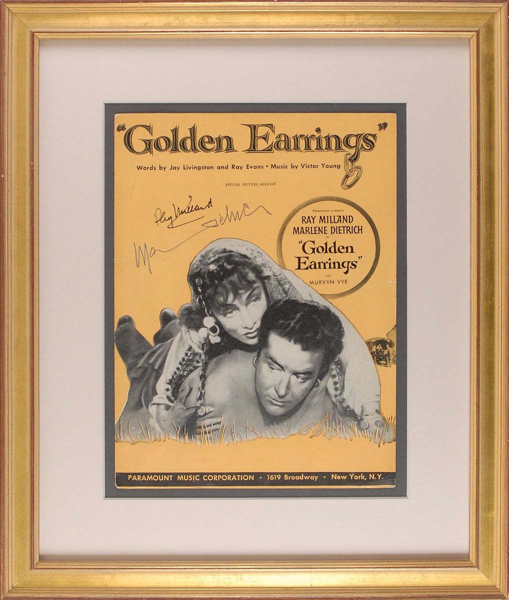 Collection of sixteen items signed by eight notable Hollywood figures, including: Fred Astaire (SP), Vivien Leigh (TLS), Will Rogers (ALS), Joan Crawford (TLS), Phillips H. Lord (seven stock certificates), James Cagney (SP and two TLSs), Marlene Dietrich (SP and sheet music, which is also signed by Ray Milland).