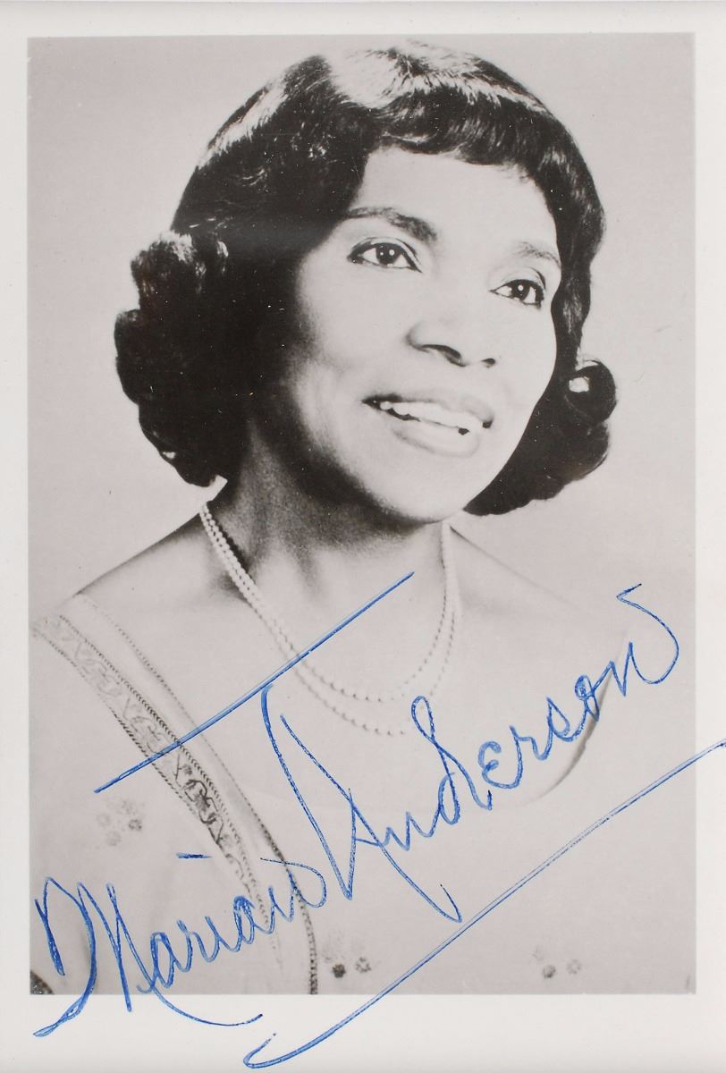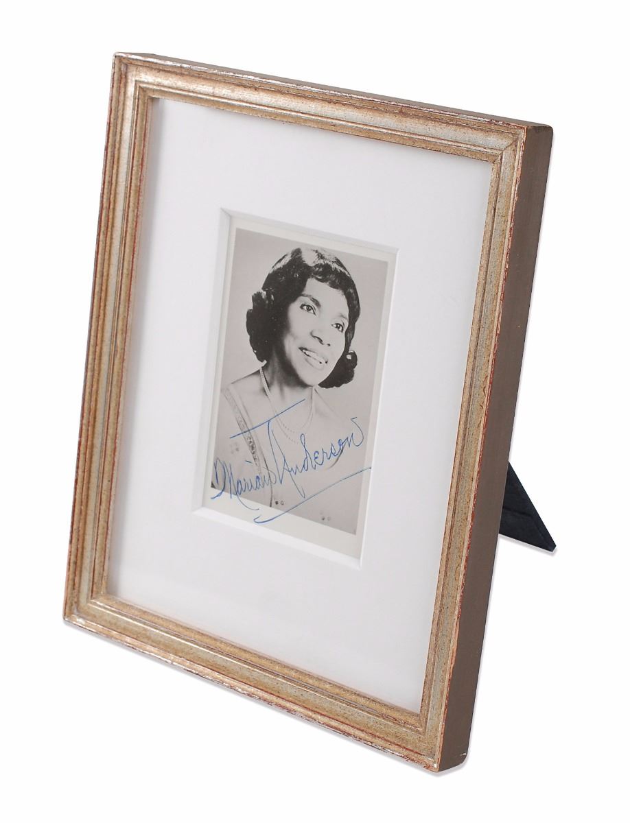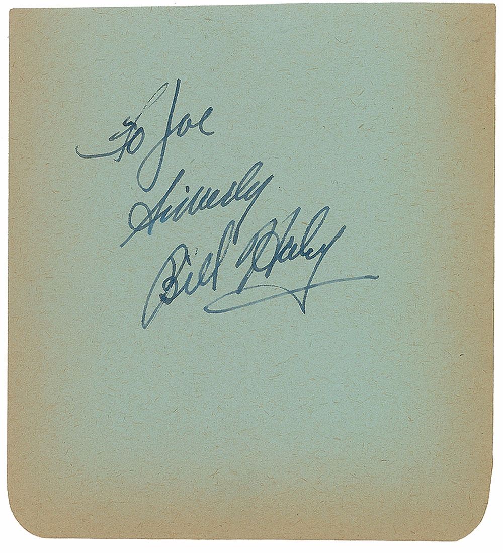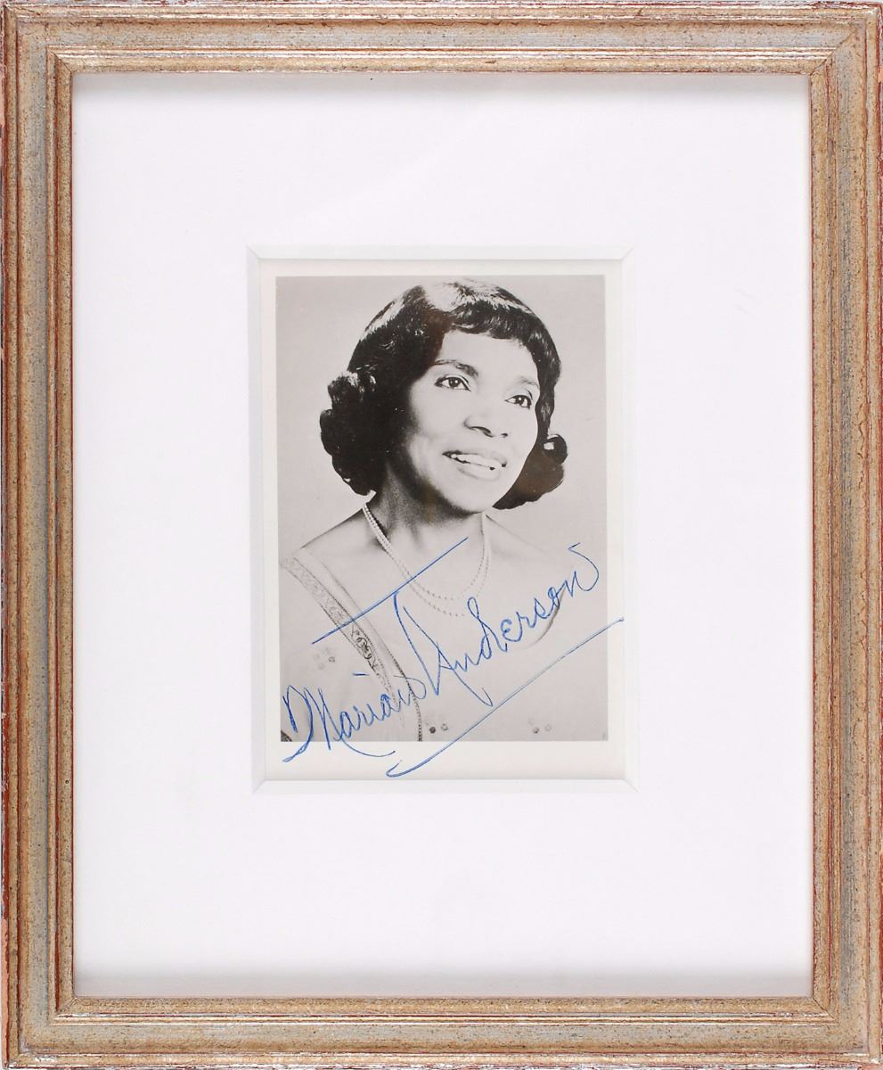 Collection of five items, each signed by one or more notable entertainers, including: Bill Haley and His Comets (signatures on two album pages, ins); Bing Crosby (SP, ins); Marian Anderson (SP); Duke Ellington (SP, ins); and Hoagy Carmichael (DS). In overall fine condition, with a small area of surface loss and a thumbprint to the Crosby.