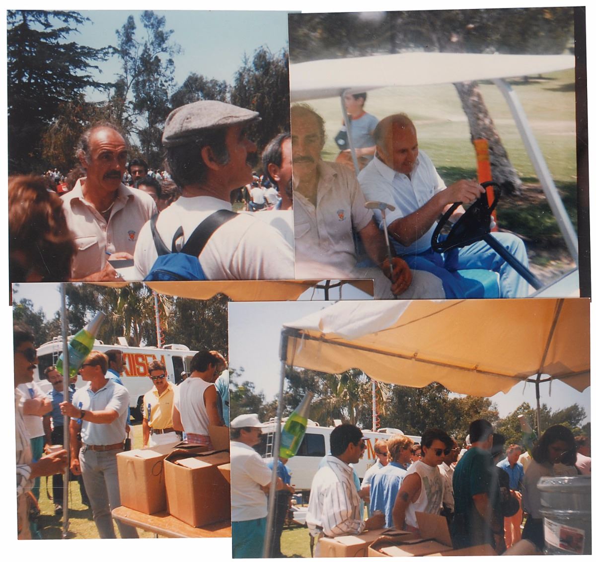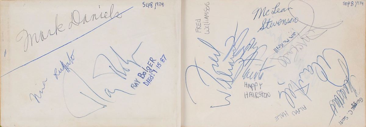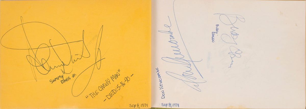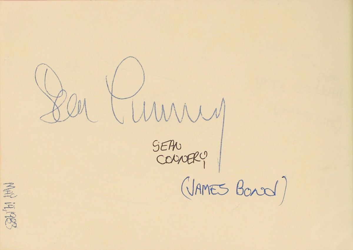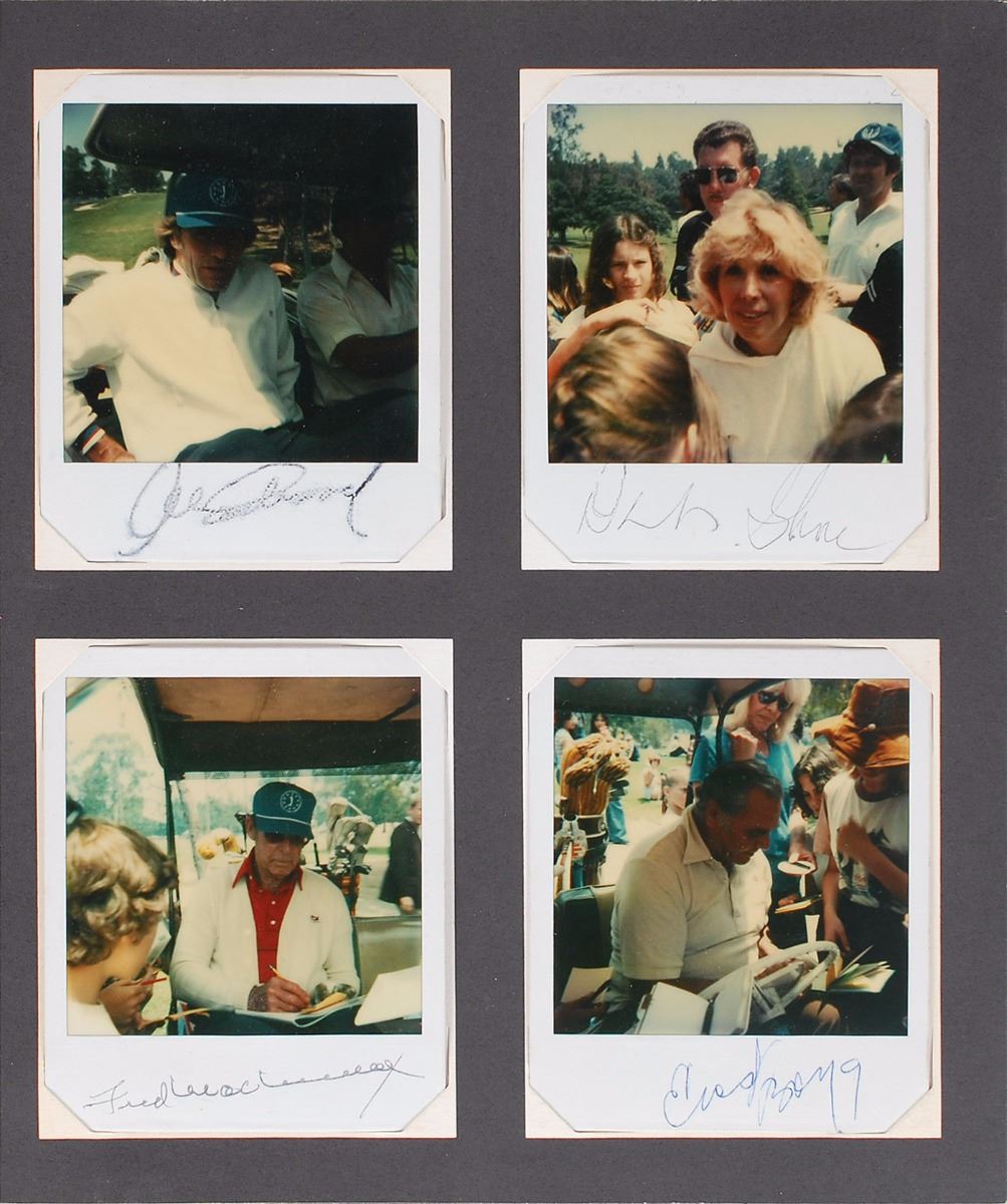 Interesting collection of an autograph album and photo album: a hardcover autograph book labeled “1974–1984,” signed inside by over 130 notable figures, including: Sean Connery, Sammy Davis, Jr., Alan Hale, George C. Scott, Ray Bolger, Bob Hope, Mickey Rooney, Glen Campbell, Buddy Ebsen, Bob Newhart, Fred Williamson, Efrem Zimbalist, Jr., Scatman Crothers, Don Knotts, Martin Sheen, Telly Savalas, Leslie Nielsen, Don Newcombe, Bill Buckner, Tommy John, Tom Harmon, Bill Sharman, Jerry West, and Happy Hairston. Second is a photo album containing thirty signed candid Polaroid photos from a golf course, including: Clint Eastwood, Dinah Shore, Fred MacMurray, Ernest Borgnine, and others. In overall fine condition.