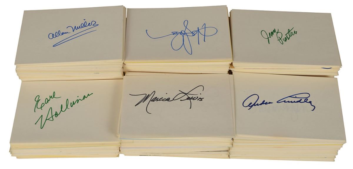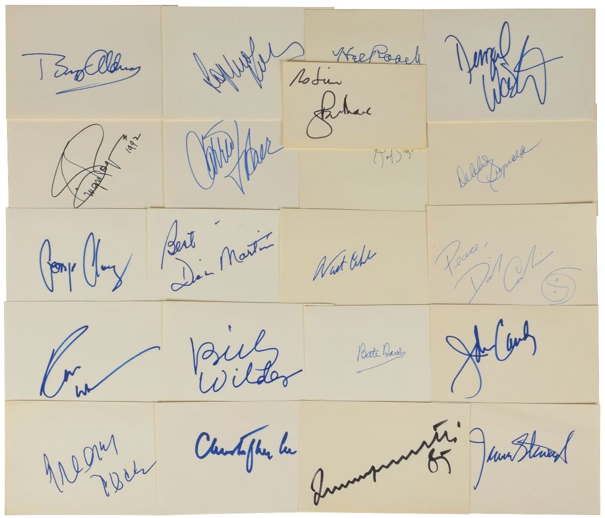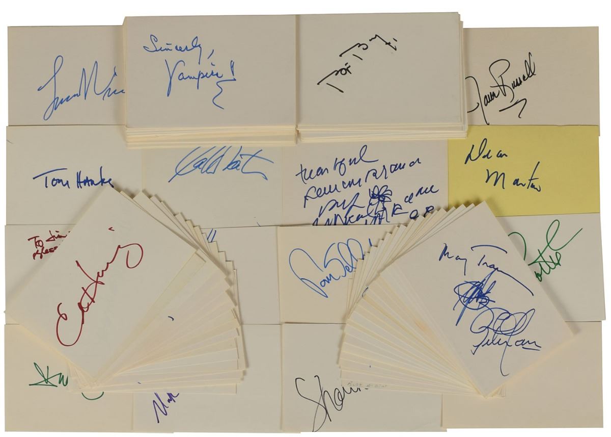 Large collection of over 2300 ink signatures of a wide variety of entertainers, primarily consisting of actors and actresses but also including a smattering of directors, singers, musicians, athletes, and notables from other disciplines. Most are on white 6 x 4 cards and the vast majority are uninscribed. Some of the most significant names include: Buzz Aldrin, Turhan Bey, Jacqueline Bisset, Bjorn Borg, Ernest Borgnine, Matthew Broderick, Mel Brooks, Pierce Brosnan, Red Buttons, Nicolas Cage, Cab Calloway, John Candy, David Carradine, Johnny Carson, George Clooney, Gary Coleman, Chuck Connors, Jimmy Connors, Kevin Costner, Walter Cronkite, Jamie Lee Curtis, Tony Curtis, Rodney Dangerfield, Bette Davis, Yvonne De Carlo, Angie Dickinson, Kirk Douglas, Kirsten Dunst, Barbara Eden, Gloria Estefan, Corey Feldman, Carrie Fisher, Morgan Freeman, Friz Freleng, Kelsey Grammer, Gene Hackman, Corey Haim, Herbie Hancock, Tom Hanks, Ed Harris, Julie Harris, Neil Patrick Harris, Goldie Hawn, Tippi Hedren, Hugh Hefner, Charlton Heston, Al Hirschfeld, Sterling Holloway, Dennis Hopper, Ron Howard, Bruce Jenner, Gene Kelly, Don Knotts, Dorothy Lamour, Cloris Leachman, Timothy Leary, Christopher Lee, Janet Leigh, Little Richard, Sophia Loren, Carol Lynley, M. C. Hammer, Karl Malden, Henry Mancini, Marcel Marceau, Dean Martin, Roddy McDowall, Ewan McGregor, Audrey Meadows, Burgess Meredith, Liza Minnelli, Ricardo Montalban, Dudley Moore, Roger Moore, Rita Moreno, Kate Mulgrew, Leonard Nimoy, Ted Nugent, Margaret O'Brien, Maureen O’Hara, Edward James Olmos, Luciano Pavarotti, Gregory Peck, George Peppard, Joe Pesci, Peter, Paul, and Mary, Sidney Poitier, Steve Reeves, Carl Reiner, Rob Reiner, Debbie Reynolds, Don Rickles, Molly Ringwald, Hal Roach, Chris Rock, Buddy Rogers, Ginger Rogers, Cesar Romero, Mickey Rooney, Jane Russell, Ann Rutherford, Gordon Scott, Tom Selleck, William Shatner, Martin Sheen, Martin Short, Neil Simon, Dean Smith, Elke Sommer, Robert Stack, Rod Steiger, Gloria Stewart, James Stewart, Jerry Stiller, Sharon Stone, Emma Thompson, Lily Tomlin, Vampira, Dick Van Dyke, Abe Vigoda, Christopher Walken, Eli Wallach, Denzel Washington, Forest Whitaker, Betty White, Billy Wilder, Andy Williams, Esther Williams, Robin Williams, James Woods, Fay Wray, and Jane Wyatt. In overall fine condition. Due to the large quantity several secretarial and/or printed signatures are included (not included in the list or count). Interested parties are encouraged to view the collection in person at our offices or call us with specific inquiries, as this collection is sold as is and no returns will be accepted.