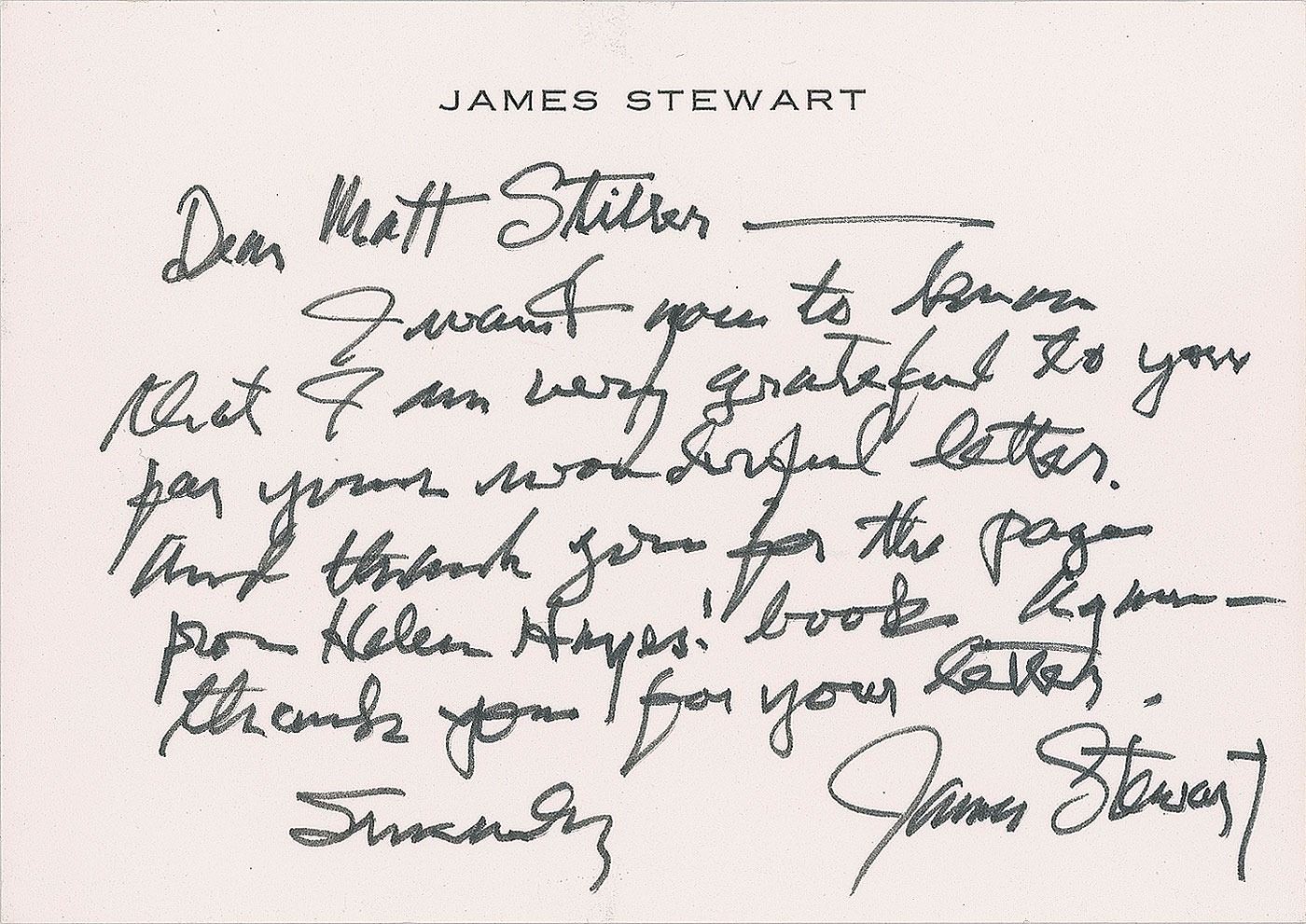 Three items: an ALS, signed "James Stewart," personal stationery, no date, in full: "I want you to know that I am very grateful to you for your wonderful letter. And thank you for the page from Helen Hayes! book again—thank you for your letter"; an FDC with a cachet honoring Radio Canada International and the opening of new high power transmitter facilities, signed in black felt tip, "Frank Capra"; and a framed philatelic cover, 6.25 x 3.5, postmarked December 6, 1982, Philatelic Sales Center, Adelaide, signed in black ink by Paul Simon and Art Garfunkel. In overall fine condition.