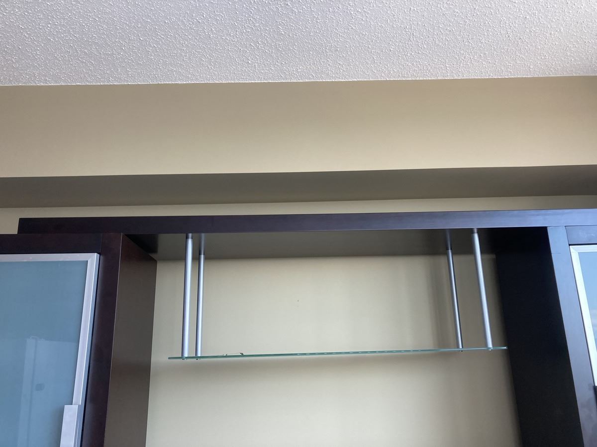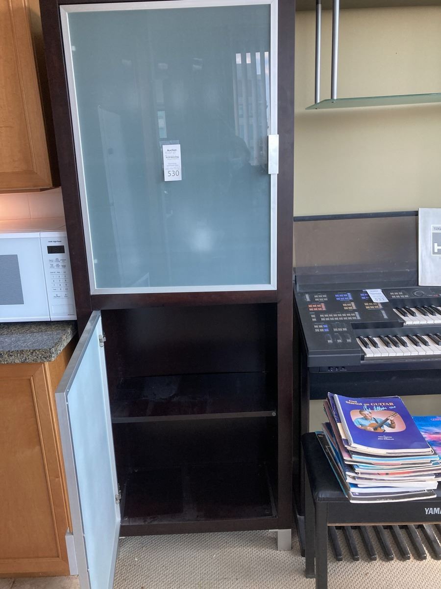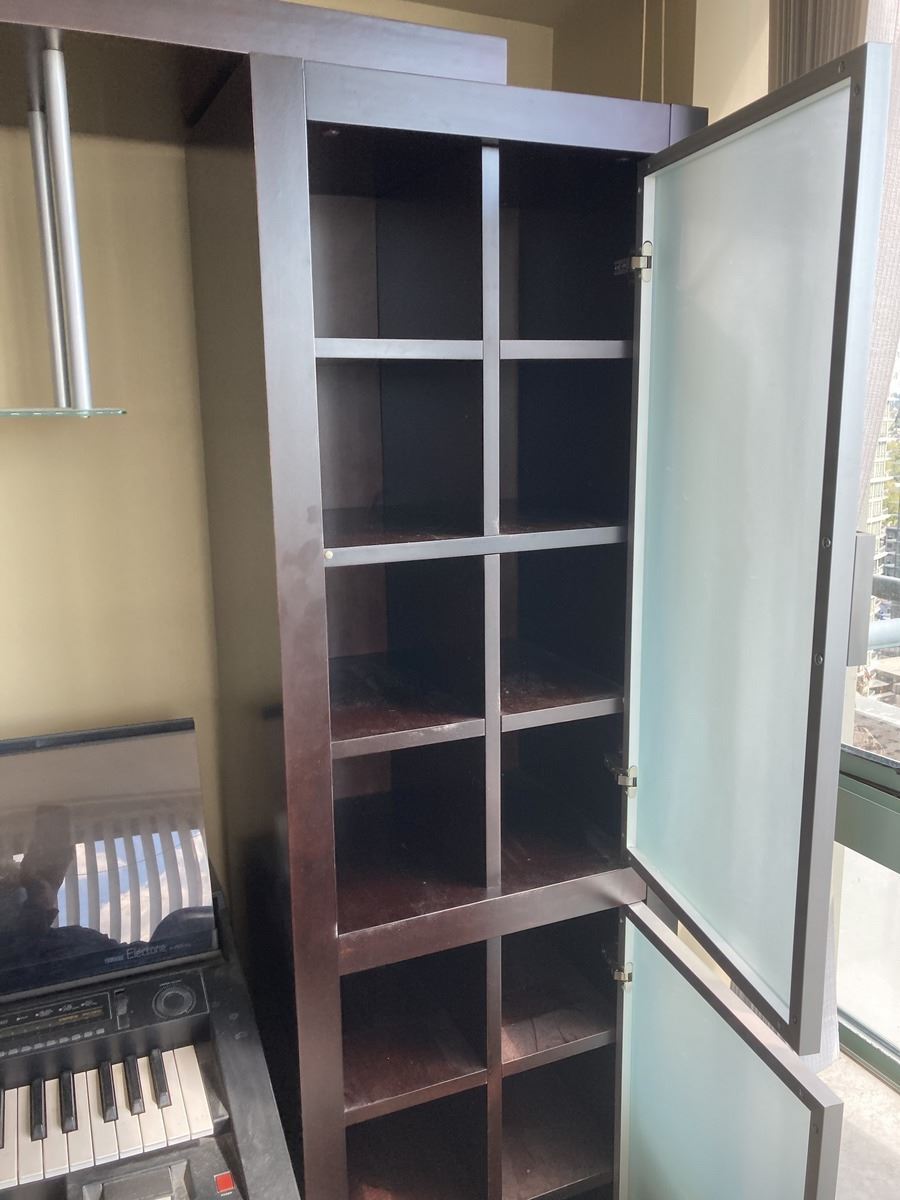Lot includes 2 cabinets with frosted glass 28x14x75 and bridge 67”. One side has partitions. Contents not included. Please note scratches. Very heavy, bring appropriate help to move. Pickup 11-12pm.