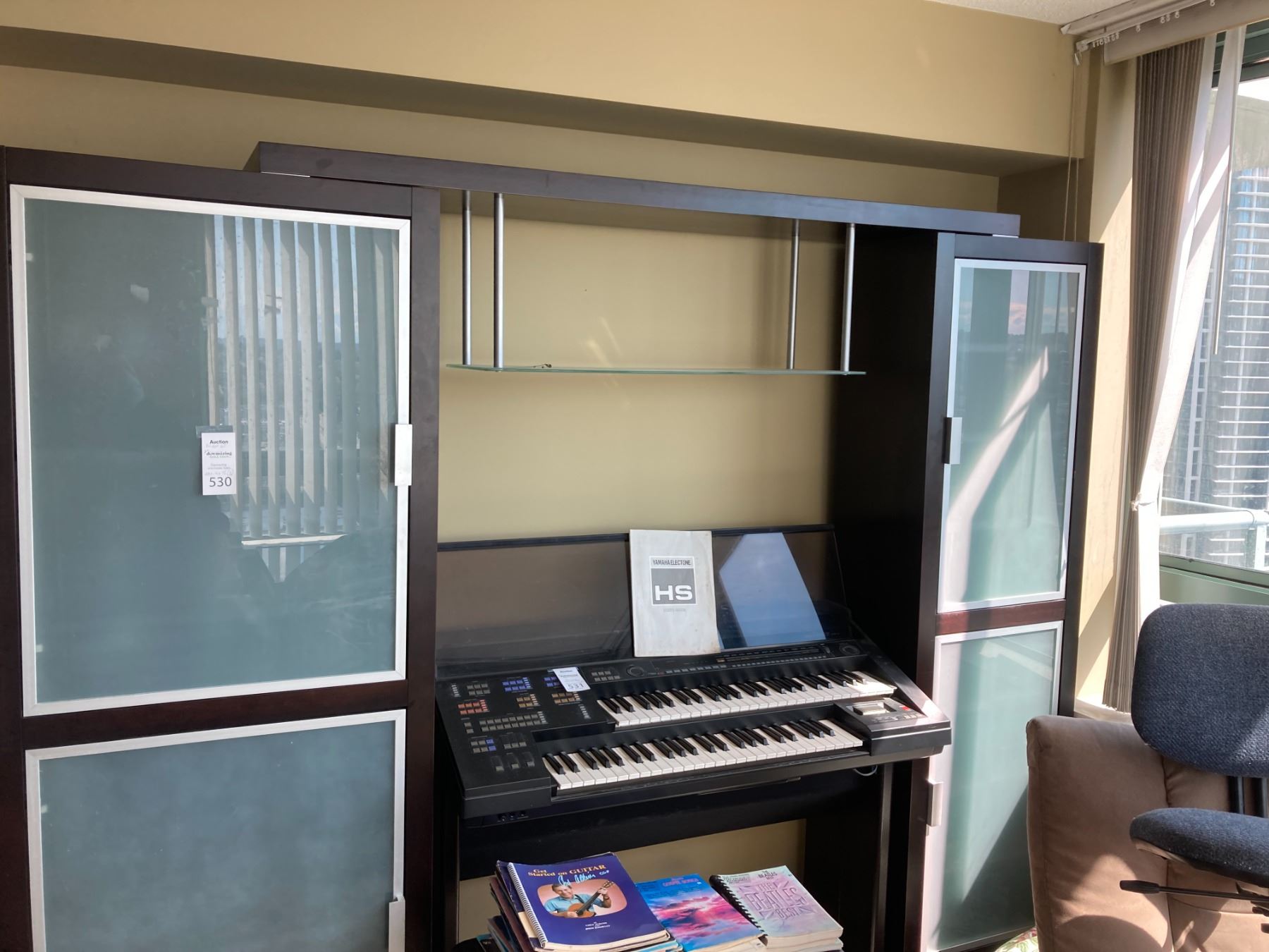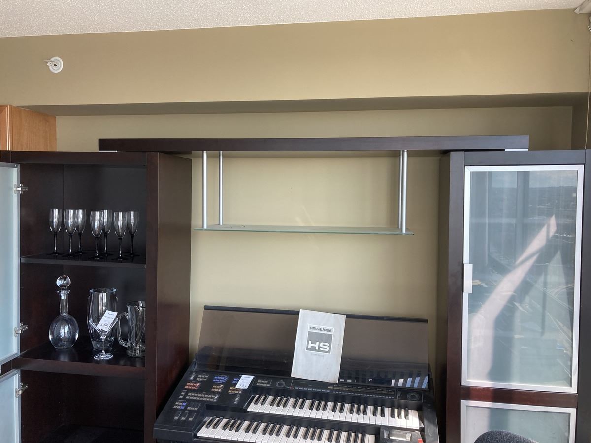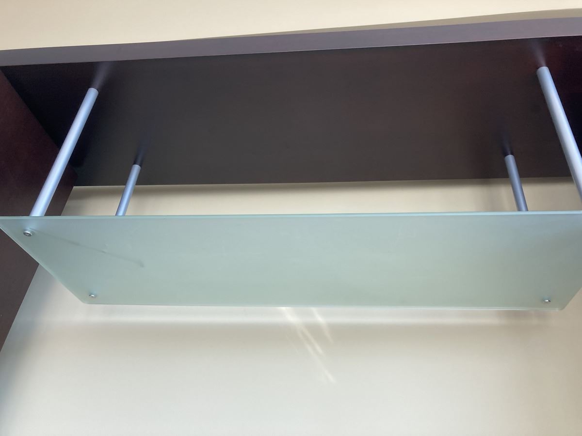 Lot includes 2 cabinets with frosted glass 28x14x75 and bridge 67”. One side has partitions. Contents not included. Please note scratches. Very heavy, bring appropriate help to move. Pickup 11-12pm.