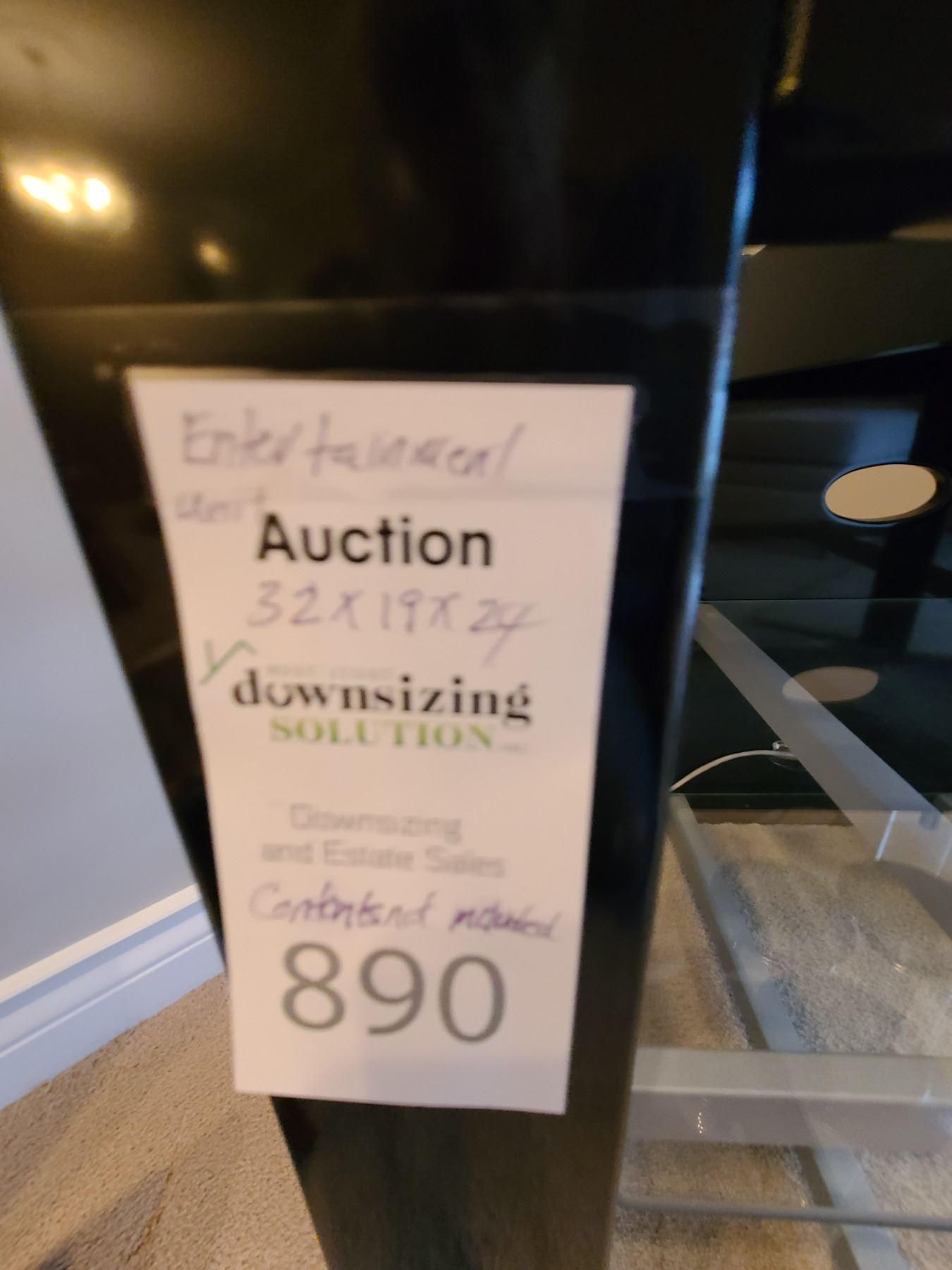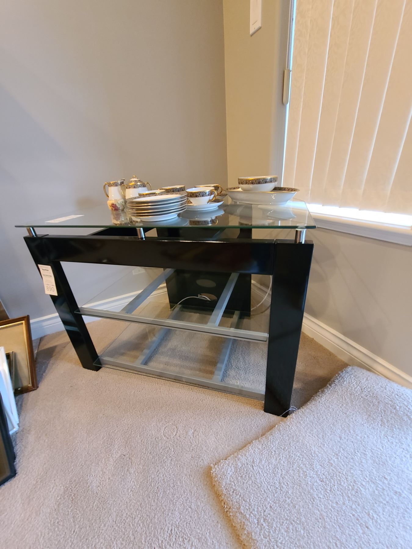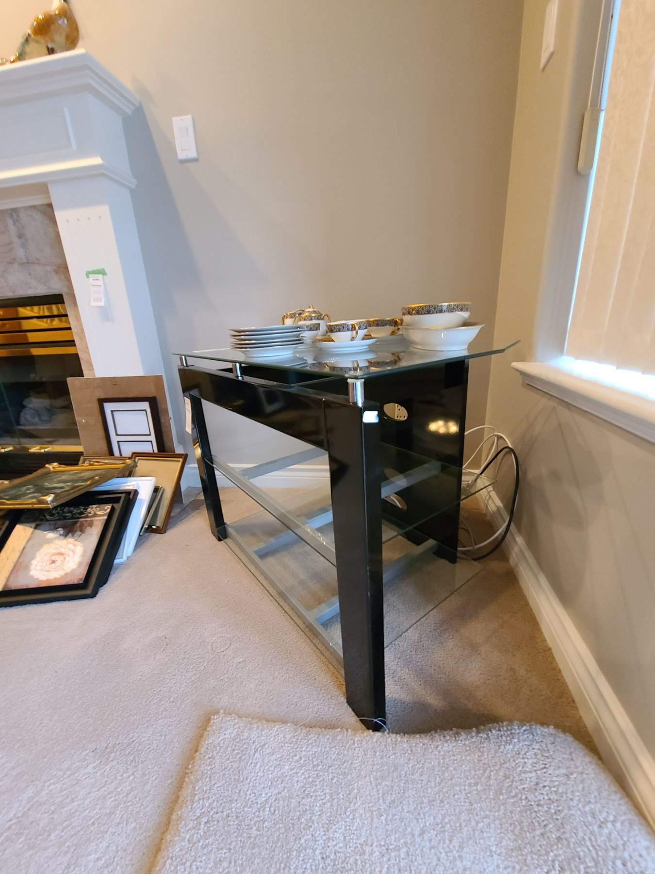 Glass and metal entertainment stand 32x18x24. Contents not included. Bring help to move. Pickup 11 am.