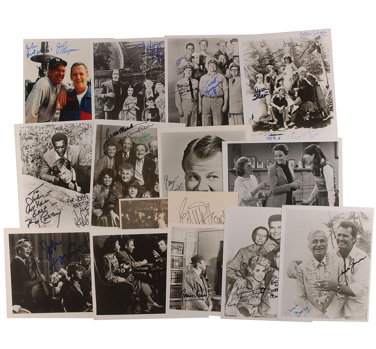 Sixteen items consisting primarily of photos, signed by many different film and television actors and actresses. Many are multi-signed cast photos, and some are inscribed. Signers include: Edmund Gwenn, C. L. Lane, James Stewart (2), Edith Head, Buddy Ebsen, Donna Douglas, Jack Klugman, Yvonne De Carlo, Butch Patrick, Pat Priest, Al Lewis, Ernest Borgnine, Tim Conway, Edson Stroll, Gavin MacLeod, Bob Denver, Natalie Schafer, Jim Backus, Dawn Wells, Russell Johnson, Tina Louise, James Garner, Noah Beery, Bill Cosby, Robert Culp, Bea Arthur, Conrad Bain, Rue McClanahan, Bill Macy, Adrienne Barbeau, Peggy Dow, Valerie Harper, Julie Kavner, Nancy Walker, Jack Lemmon, Tony Curtis, Alan Hale, Jr., and Sandy Dennis. In overall fine condition.