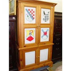 Entertainment Unit, 20th Century, Pine, Decorated with Family Coat of Arms (Wired for Electricity, Structurally Sound, Fair Condition).