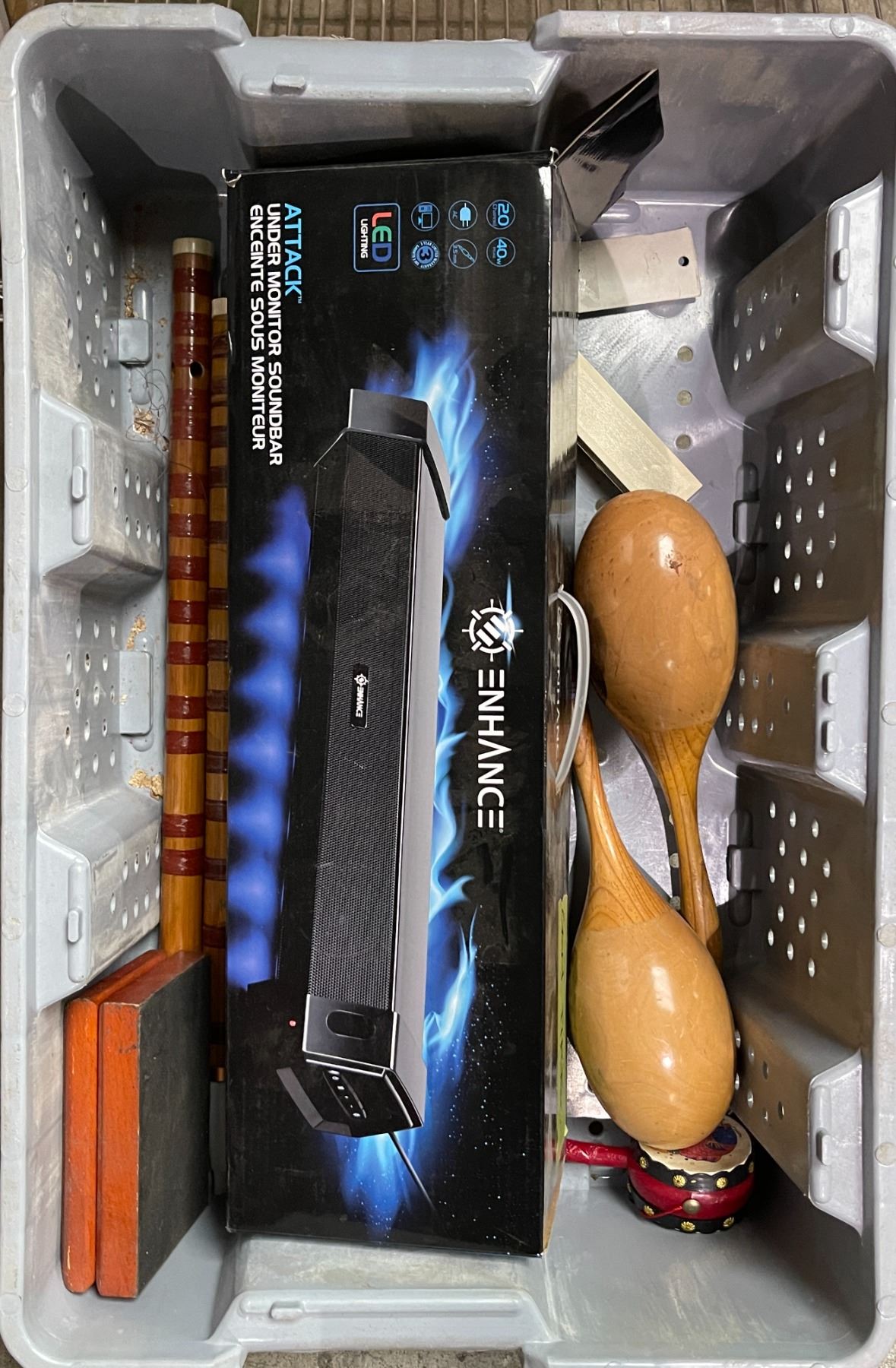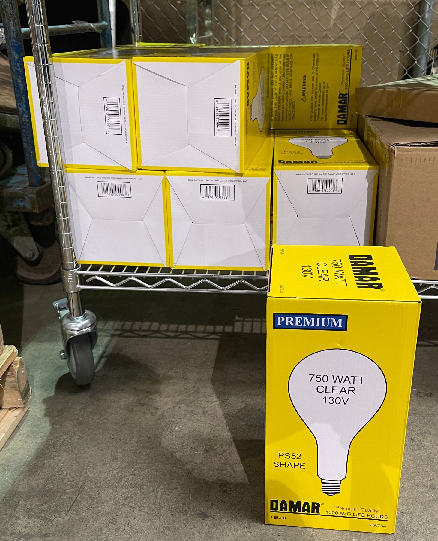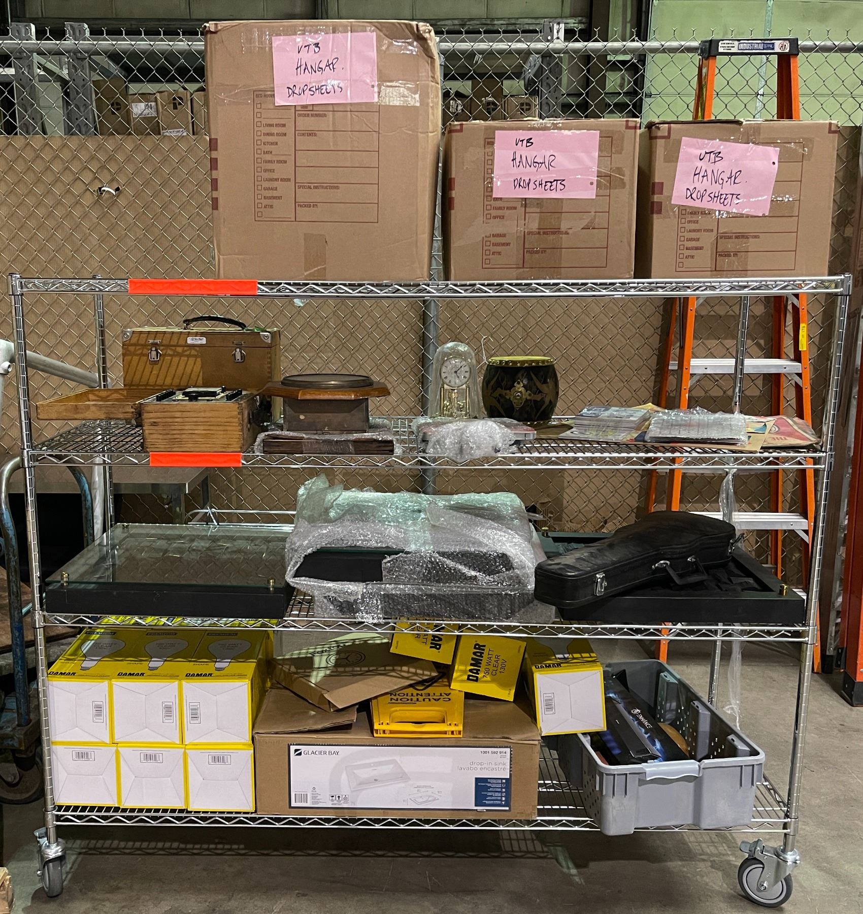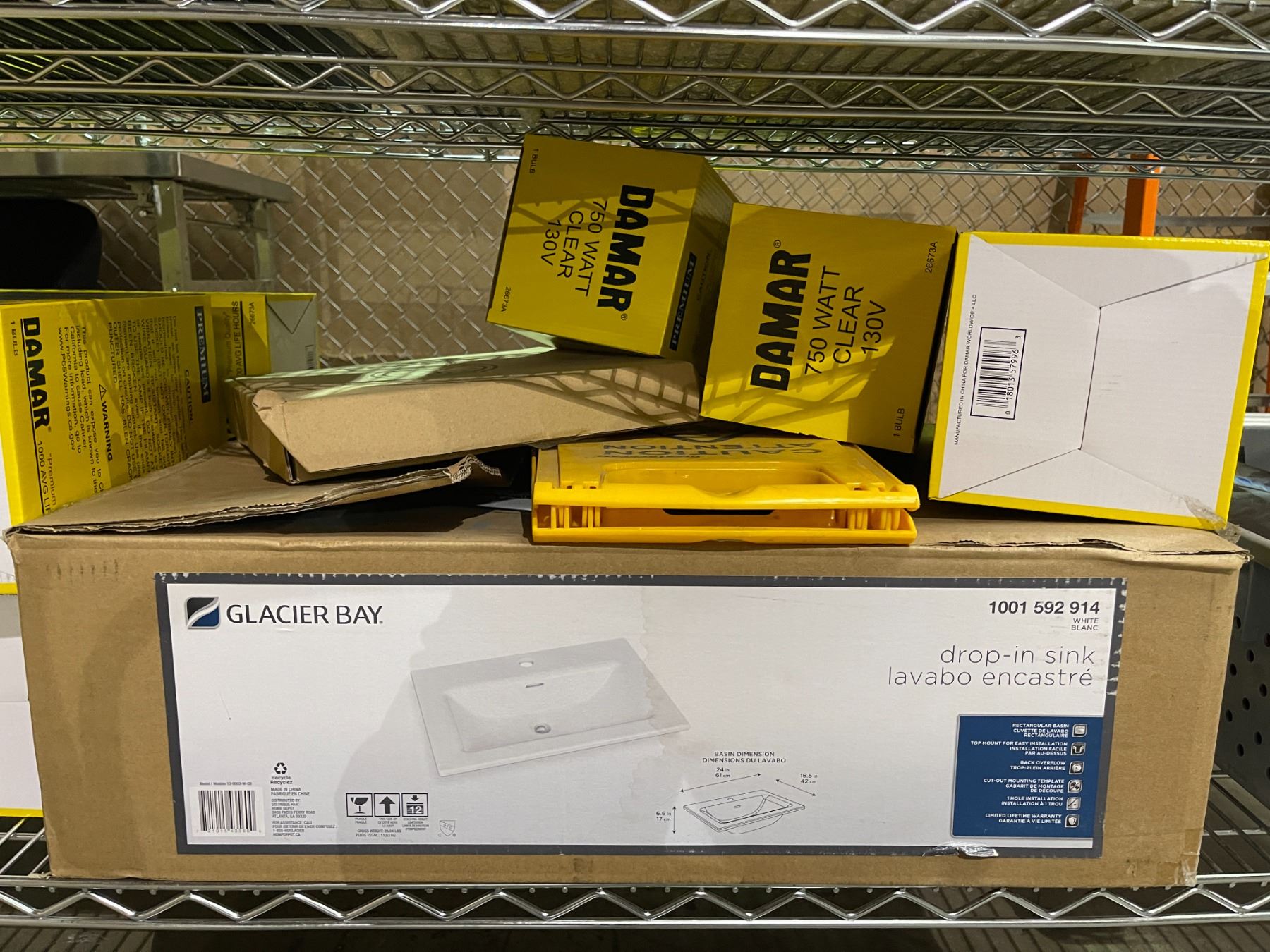 Entire shelf full of assorted misc items - includes Glacier Bay drop-in sink / Enhance under monitor soundbar / Eurostar quartz clock / Damar 750 watt clear 130V light bulbs / hangar drop sheets etc (rolling shelf not included)