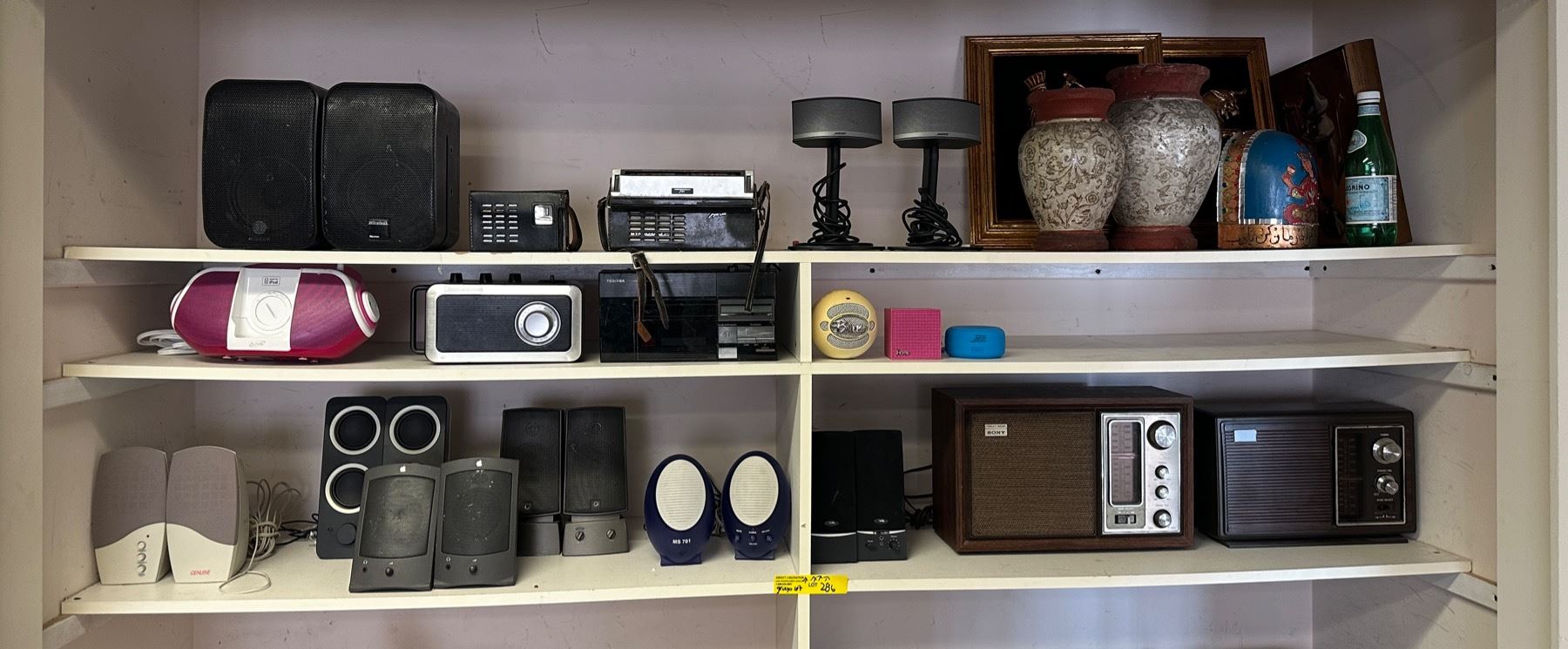 Entire shelf lot full of assorted items - includes Bose speakers vintage Sony FM/AM 2band radio /ICF-9650W / Toshiba disk player / vintage speakers etc