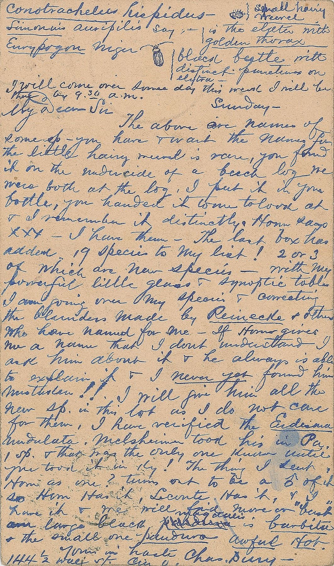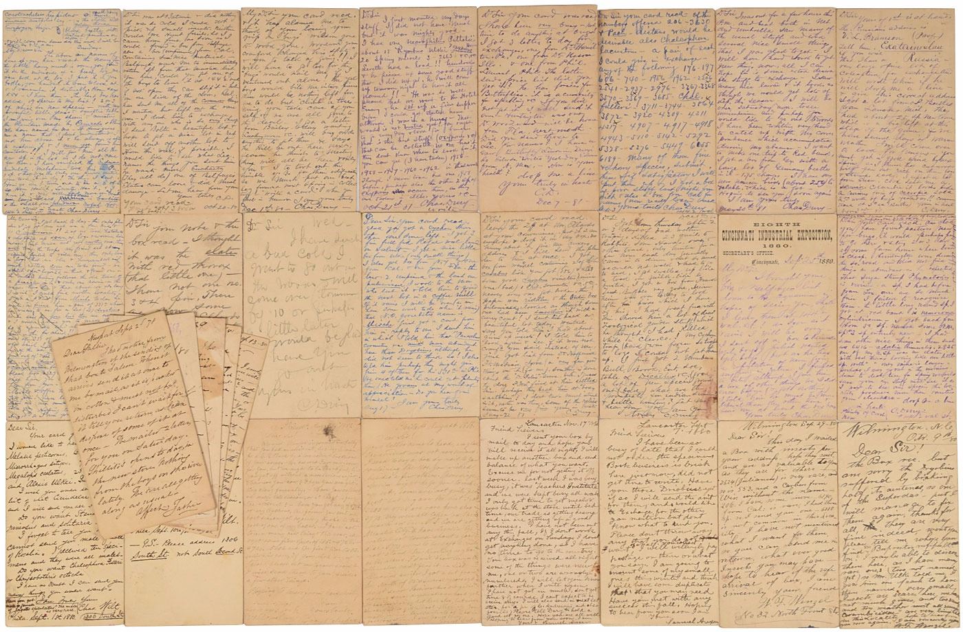 Collection of 28 ALSs on postcards sent to Charles G. Siewers by various entomologists, dated from the 1870s to 1880s, including: Charles Dury (16), Charles Wilt (2), C. Ernest Seeber (2), Samuel Auxer (2), George S. Huntington (2), W. F. Wenzel (3), and Henry Skaer (1). Also includes one postcard from Charles G. Siewers to his daughter, signed “Father.” Most of the correspondence concerns their scientific work, especially the exchange of insect specimens. In overall fine condition. An unusual and interesting group.