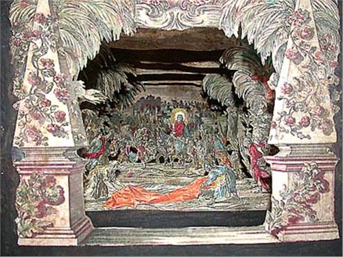 Entrée du Christ à Jérusalem. 7 plans de 21 x 24 cm. Décor gravé à l'eau-forte et aquarellé avec bords noircis au brou de noix, sur carton d'époque, n° 37 gravé sur le dernier plan, titre numéroté "nombre 5" (défraîchi, traces de moisissure). Sous enveloppe de l'époque en papier.