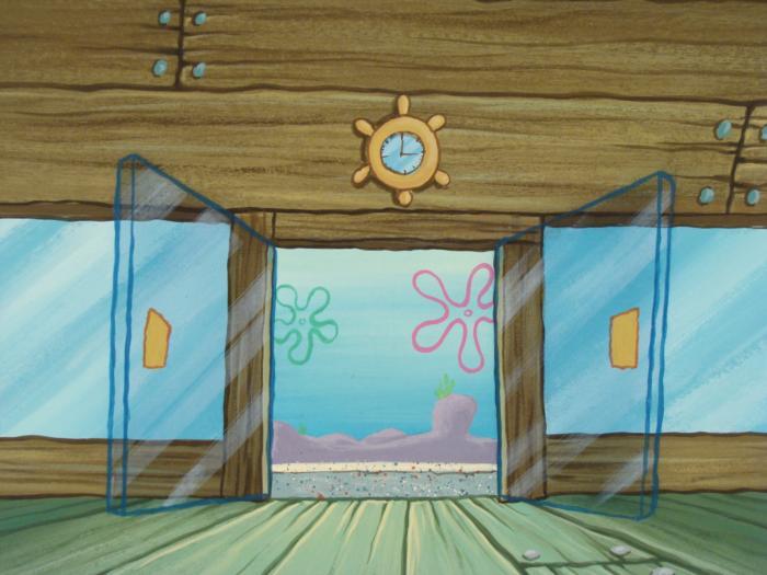 This original hand-painted background from the Nickelodeon TV show SpongeBob Squarepants. The story takes place under the deep blue sea in Bikini Bottom, where SpongeBob resides. SpongeBob, who is a yellow, porous sponge, is your typical happy-go-lucky character, as he is always cheerful and enjoys making people laugh. Patrick Star, SpongeBob's neighbor who is a starfish, is your average children's show idiot, as he boasts knowing nothing and is often getting himself into ridiculous situations. Between the homes of these two lies the home of the miserable Squidward, a squid, who is known for being grouchy and playing tricks on SpongeBob and Patrick. Both SpongeBob and Squidward work at the Krusty Krab, a fast food business run by the greedy money-loving Mr. Krabs, a crab, the arch rival of the evil, possibly misunderstood, Plankton. Another neighbor, Sandy Cheeks, an athletic squirrel who normally wears an astronaut's space suit, was introduced in "Tea at the Treedome." She spends most of her time inventing and experimenting. This is the entrance to the Krusty Krab.Original Production Background Overall Size of Background: 10 1/2" x 13 3/4" Very good conditionOriginal Production Backgrounds are used in the making of the final version of animated productions. The background establishes the location and the overall good mood of the scenee. Typically, a background layout artist creates a drawing to establish the content of the scene, placement of characters, perspective and camera angle. Based on this drawing, the background artist creates a preliminary painting to confirm all of the scenes details, then the final production background which is used in the filming of the scene. When these backgrounds are individually photographed behind the progression of production cels, and projected at a rapid succession, the images in the foreground appear to move, creating an animated scene. The background is ready to be matted and framed. It is a colored background with the animator's notations at the bottom.