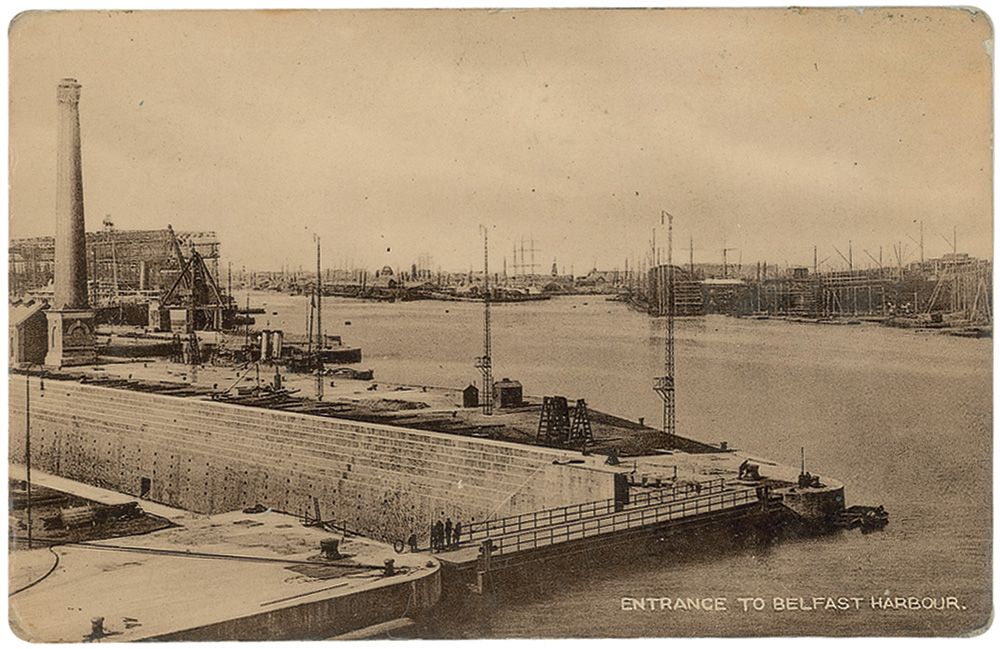 Unused real photo postcard by Hurst & Co. of Belfast, with an image of the entrance to the harbor where the Titanic was designed and built, captioned at the bottom: “Entrance to Belfast Harbour.” Some light spotting to the finish, and scattered soiling and a pencil notation to the reverse, otherwise fine condition.