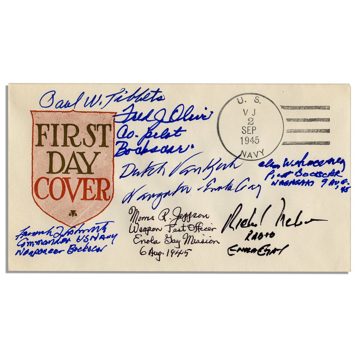7 signatures of Enola Gay & Bockscar crew members upon a first day cover. U.S. Navy envelope is postmarked 2 September 1945 and signed: ''Paul W. Tibbets'', ''Fred J. Olivi / Co-pilot / Bockscar'', ''Dutch Van Kirk / Navigator - Enola Gay'', ''Chas W. Sweeney / Pilot Bockscar / Nagasaki 9 Aug / '45'', ''Rich Nelson / Radio / Enola Gay'', ''Fredrick Ashworth / Commander US Navy / Weaponeer Bockscar'', ''Morris R. Jeppson / Weapon Test Officer / Enola Gay Mission / 6 Aug. 1945''. Measuers 6.5'' x 3.5''. Near fine.