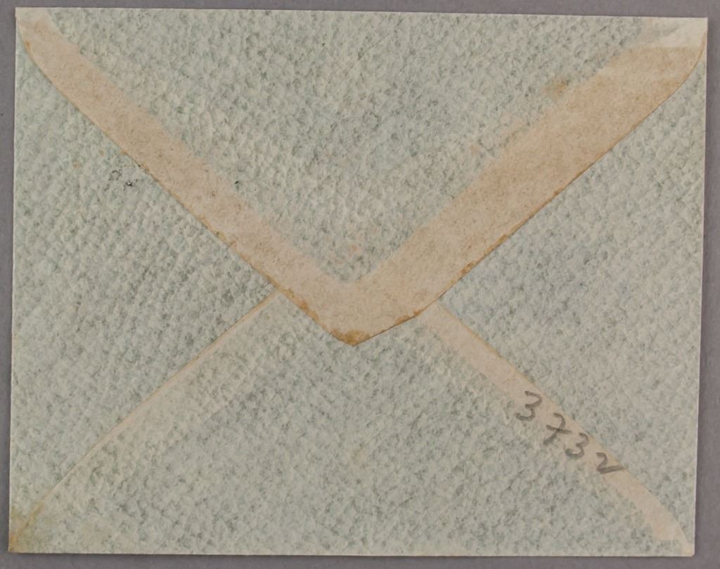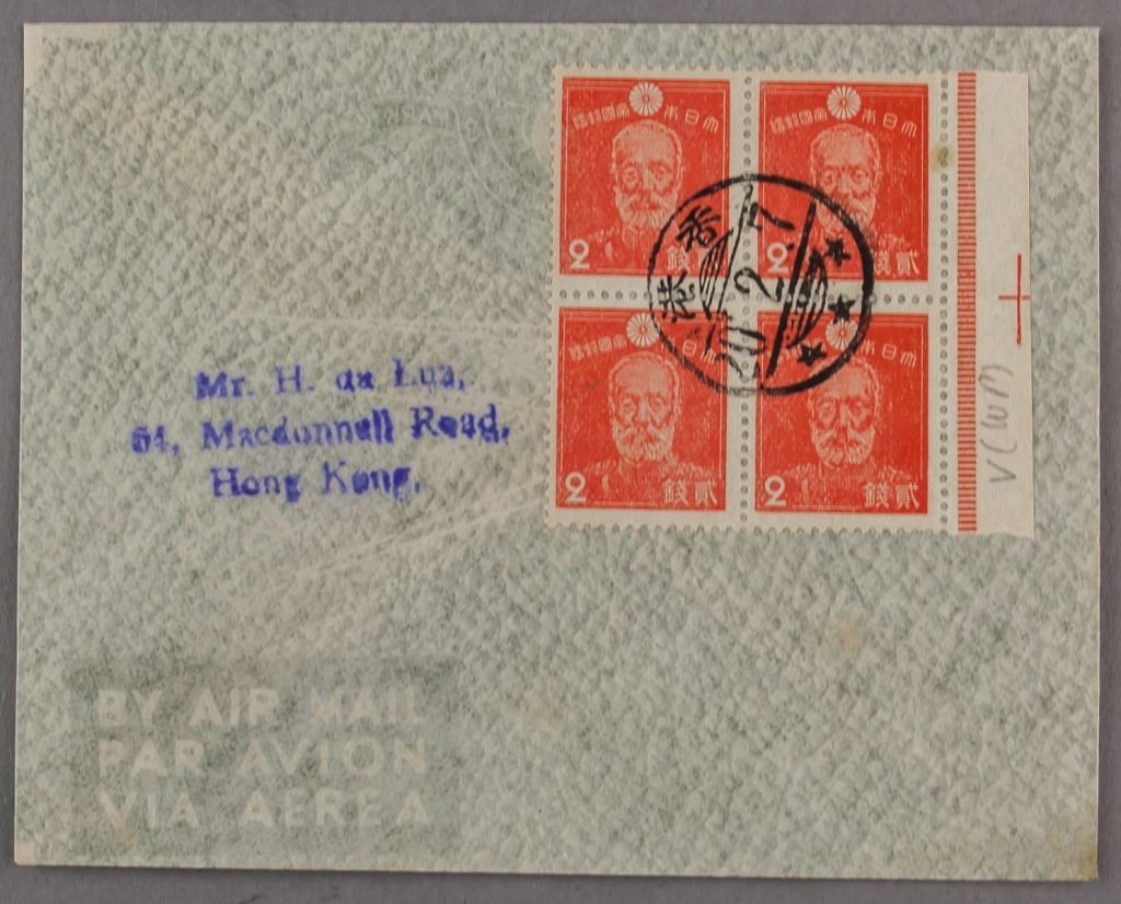 Envelope with stamps. Addressed to Hong Kong with four Japanese stamps. With Air Mail stamp to the bottom left. 9.5 x 12 cm.