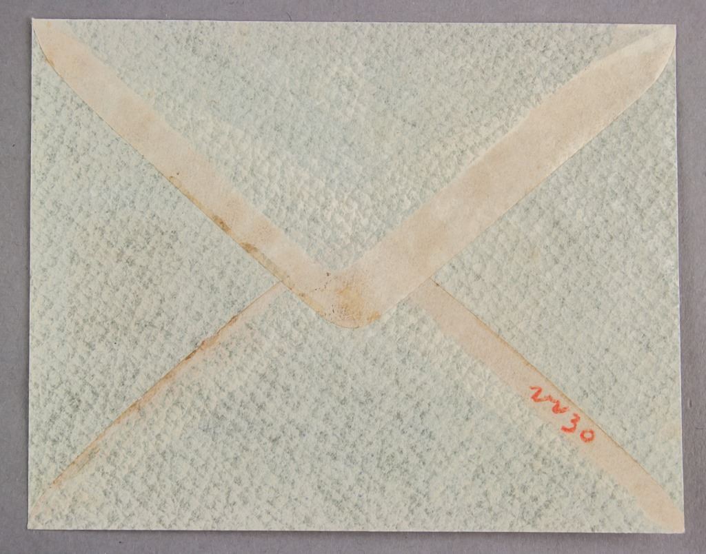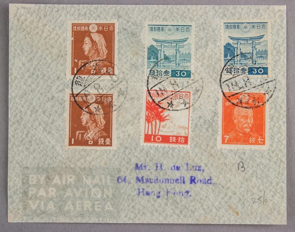 Envelope with stamps. Addressed to Hong Kong with six Japanese stamps. With Air Mail stamp to the bottom left. 9.5 x 12 cm.