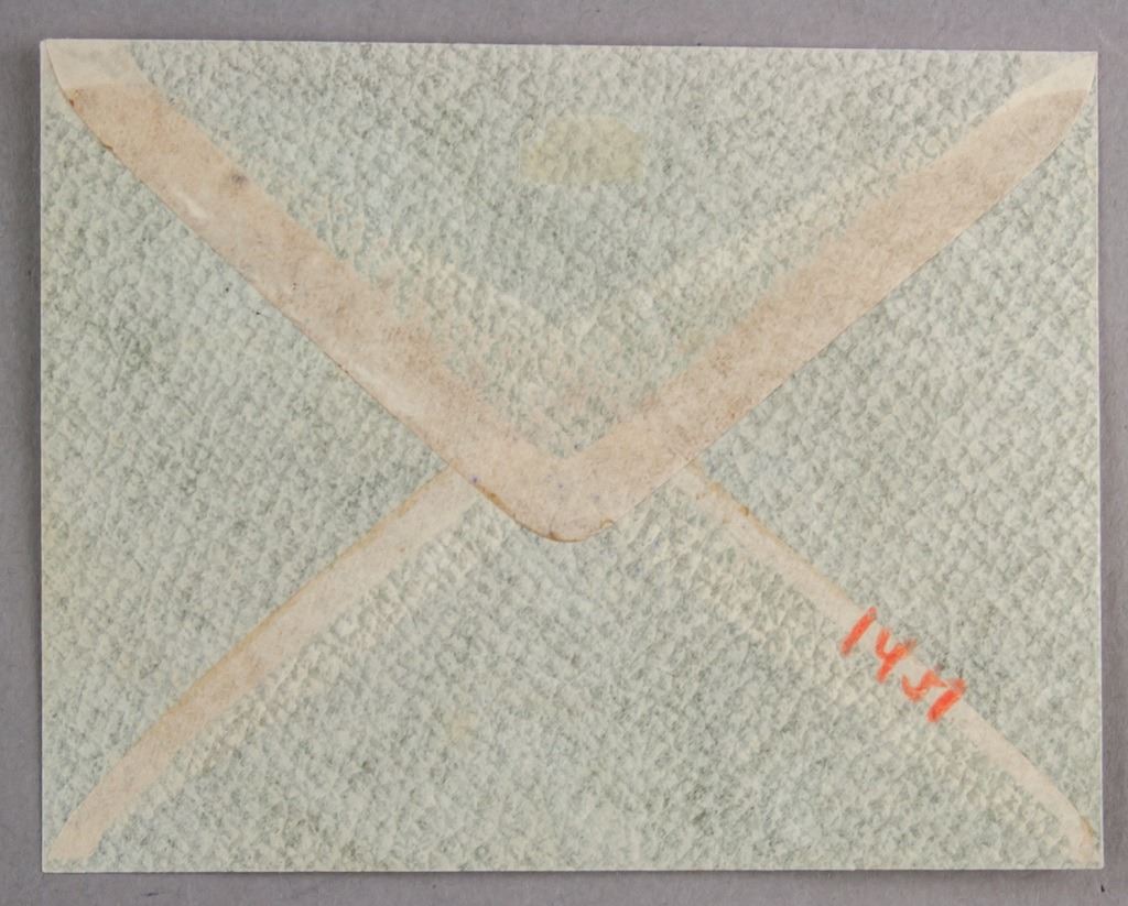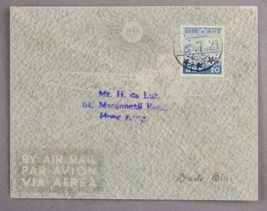 Envelope with stamp. Addressed to Hong Kong with Japanese stamp. With Air Mail stamp to the bottom left and inscribed signature to the bottom right. 9.5 x 12 cm.