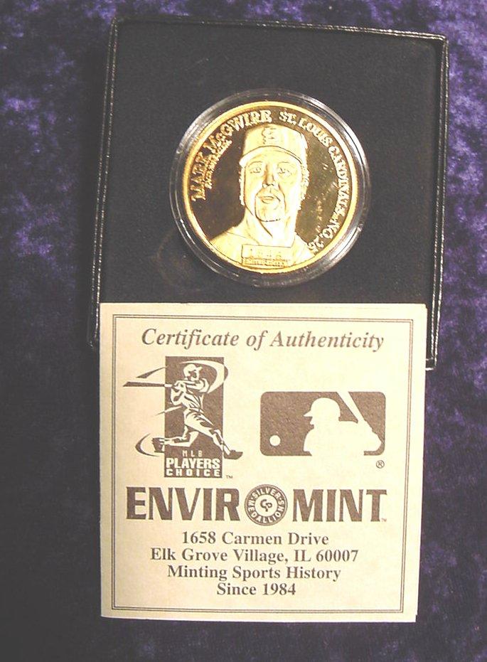 Enviromint Mark McGwire Medal. Proof Bronze. Encapsulated. No. 1846 of 1,998. Officially licensed by the Major League Baseball Players Association. In velvet box with certificate of authenticity. 39mm