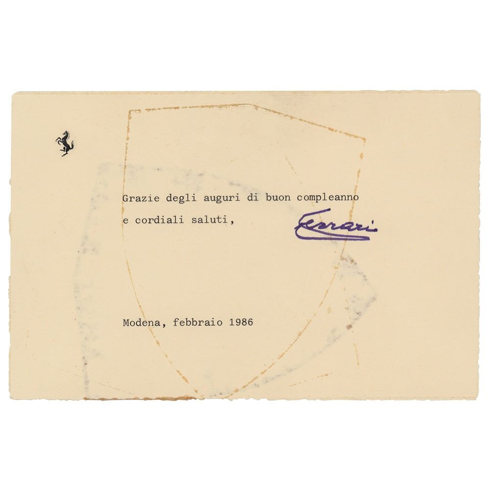 TLS in Italian, signed “Ferrari,†one page, 6.25 x 4, Ferrari letterhead, February 1986. In full (translated): "Thanks for the happy birthday wishes and best regards." In very good to fine condition, with some light staining, including show-through from adhesive remnants to back.