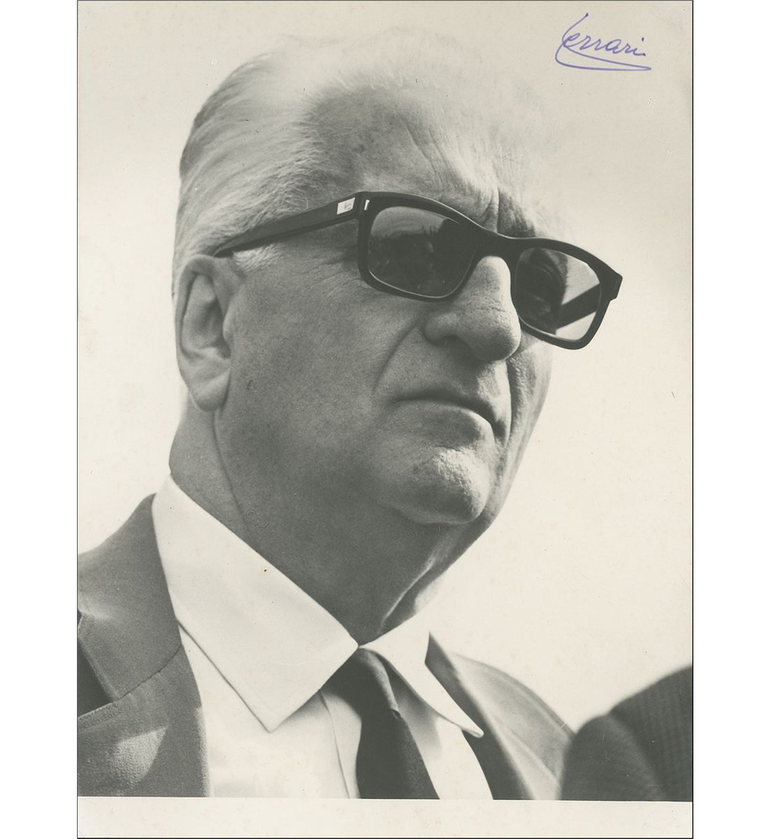 Italian automotive magnate (1898–1988) whose sports cars are prized the world over as both a classic example of industrial design and an iconic status symbol. Vintage matte-finish 6.75 x 9.25 photo of Ferrari in sunglasses, signed in purple ink, “Ferrari.” A few creases and a bit of light foxing along left edge, otherwise fine condition. Signed photos of Ferrari in this size are quite elusive and, appropriately, aggressively pursued.