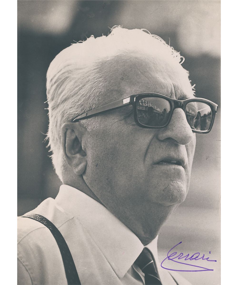 Italian automotive magnate (1898–1988) whose sports cars are prized the world over as both a classic example of industrial design and an iconic status symbol. Matte-finish 4.75 x 6.75 photo of Ferrari in sunglasses, signed in purple ink, “Ferrari.” In fine condition, with a crease to the lower right corner (passing through a single letter of the signature).