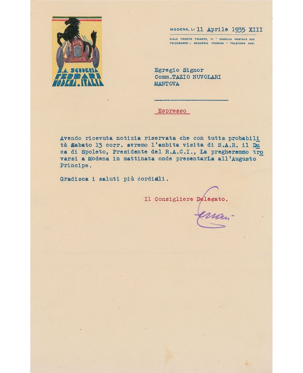 Rare TLS in Italian, signed “Ferrari,” one page, 7 x 10.75, colorful Ferrari letterhead, April 11, 1935. Letter to racing legend Tazio Nuvolari. In part (translated): “Having received confidential information that in all probability Saturday 13th inst. we will have the coveted visit from HRH the Duke of Spoleto, President of the RACI, I pray to be in Modena in the morning in order to present it to the venerable Prince.” In fine condition. Prince Aimone, Duke of Spoleto, was the president of the Reale Automobile Club d’Italia, and it seems that Ferrari was eager to give the distinguished guest a tour of his factory in Modena, where he founded his legendary automobile company. A wonderful letter rife with important associations, especially desirable because of its spectacular Ferrari letterhead.
