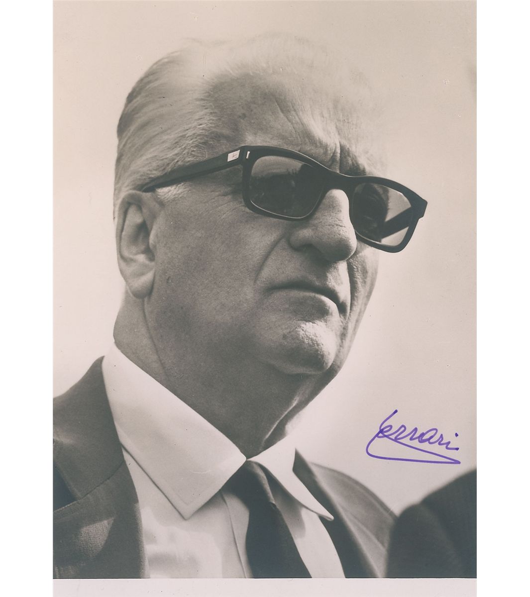 Highly desirable matte-finish 4.75 x 7 portrait of the important automaker wearing dark sunglasses, signed in purple felt tip, “Ferrari.” Reverse is stamp-dated November 9, 1968, though signed later. In fine condition.