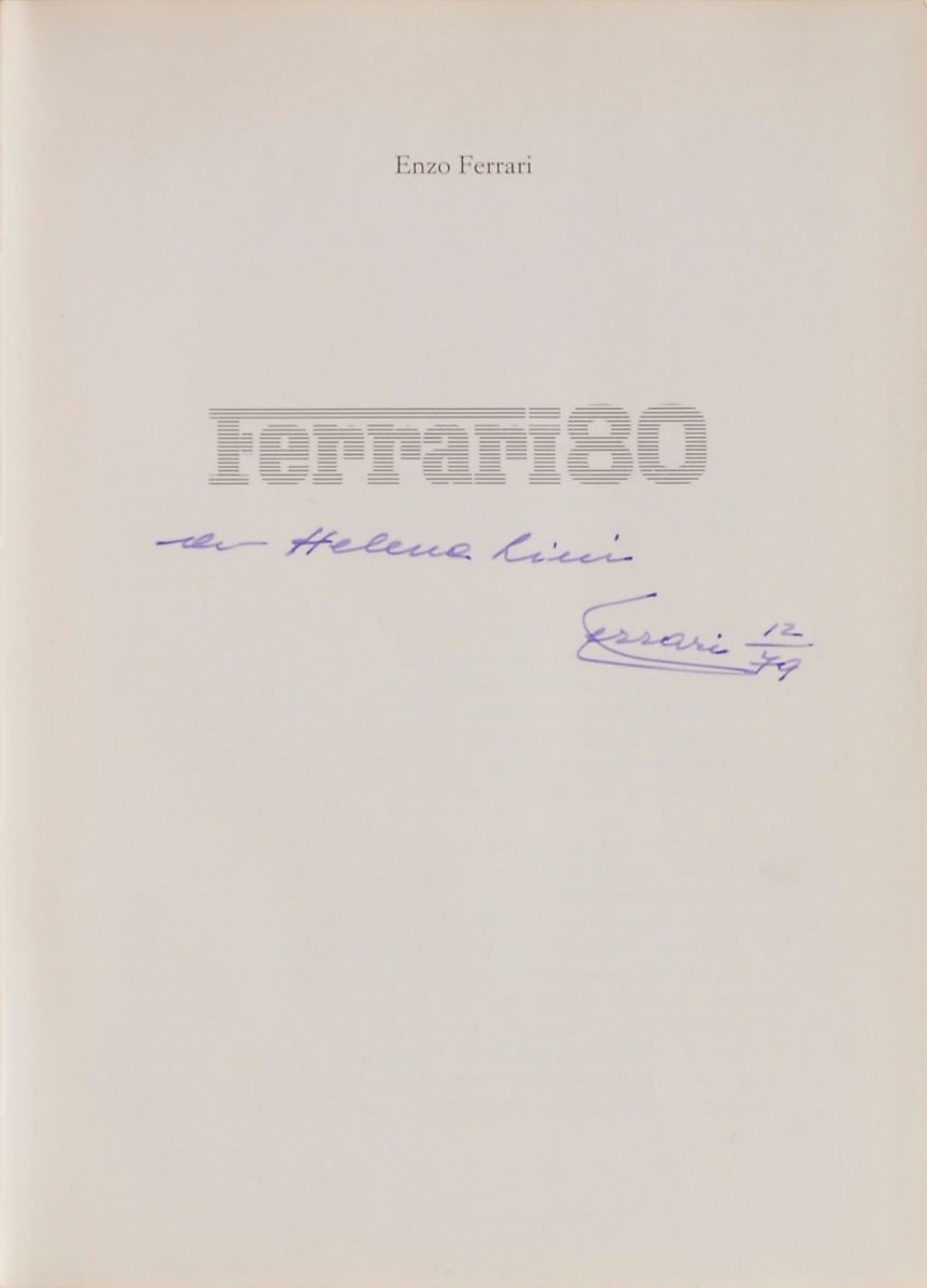 Signed book in Italian: Ferrari 80. Limited edition of 1000. 1979. Hardcover, 6.75 x 9.75, 230 pages. Signed and inscribed in Italian on the title page in purple ink, “A Helena…Ferrari 12/79.” In fine condition. Accompanied by a full letter of authenticity from JSA.