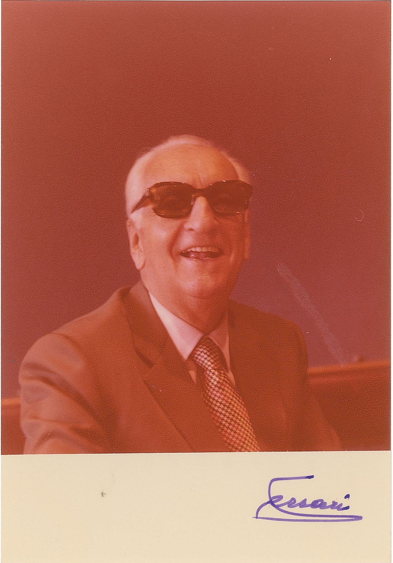 Color satin-finish 4 x 5.5 photo of Enzo Ferrari wearing sunglasses, signed in the lower border in purple felt tip, "Ferrari." In fine condition, with a thin light stain to the background.