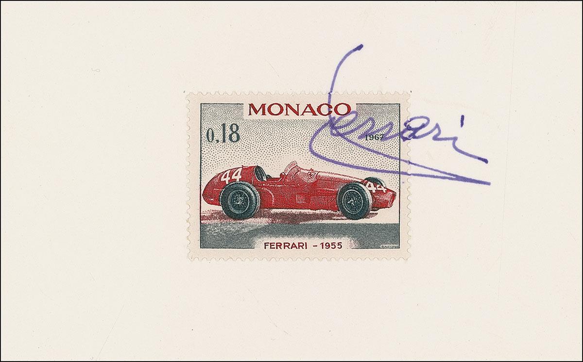 Italian automotive magnate (1898–1988) whose sports cars are prized the world over as both a classic example of industrial design and an iconic status symbol. Ink signature, “Ferrari,” on a white 4.25 x 2.75 card bearing a Ferrari commemorative postage stamp from Monaco. In fine condition, with Ferrari signing over portion of the stamp. Pre-certified Steve Grad/PSA/DNA and RRAuction COA.