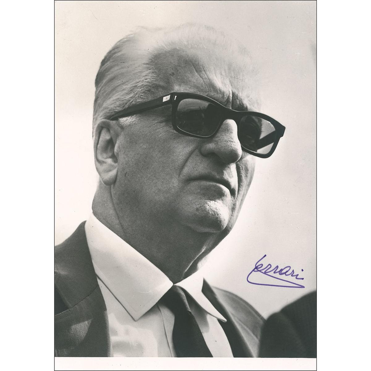 Uncommon matte-finish 5 x 7 photo of Ferrari in sunglasses, signed in purple felt tip, “Ferrari.” In fine condition, with a couple trivial creases to top right corner, and a hint of silvering to bottom. Signed photos of Ferrari are quite elusive and, appropriately, aggressively pursued.