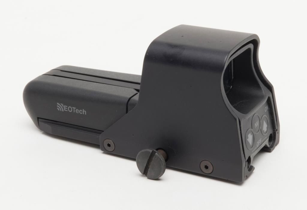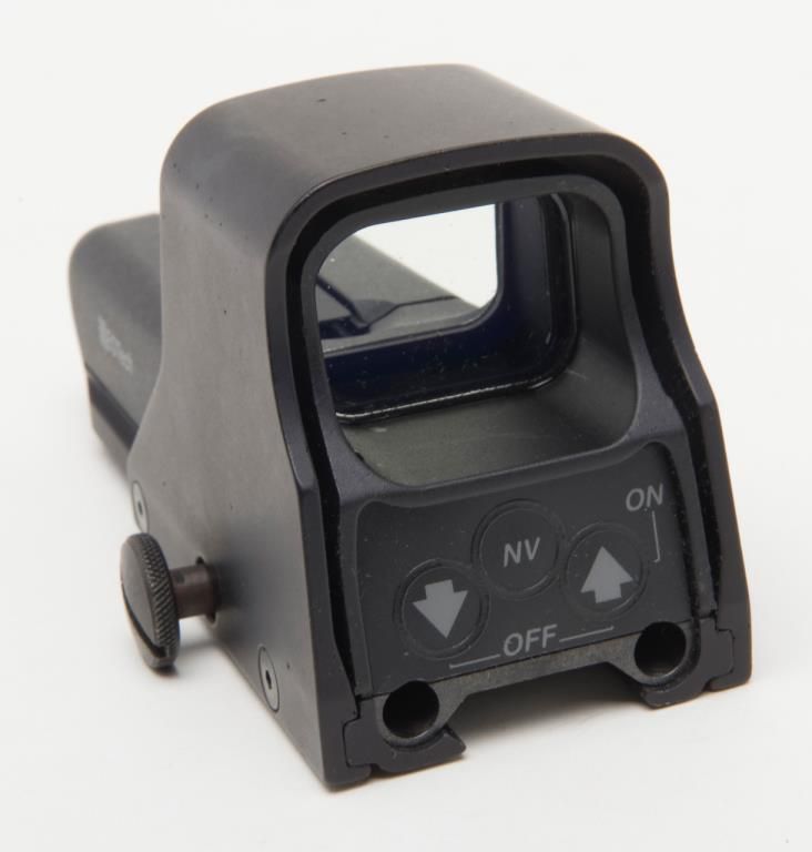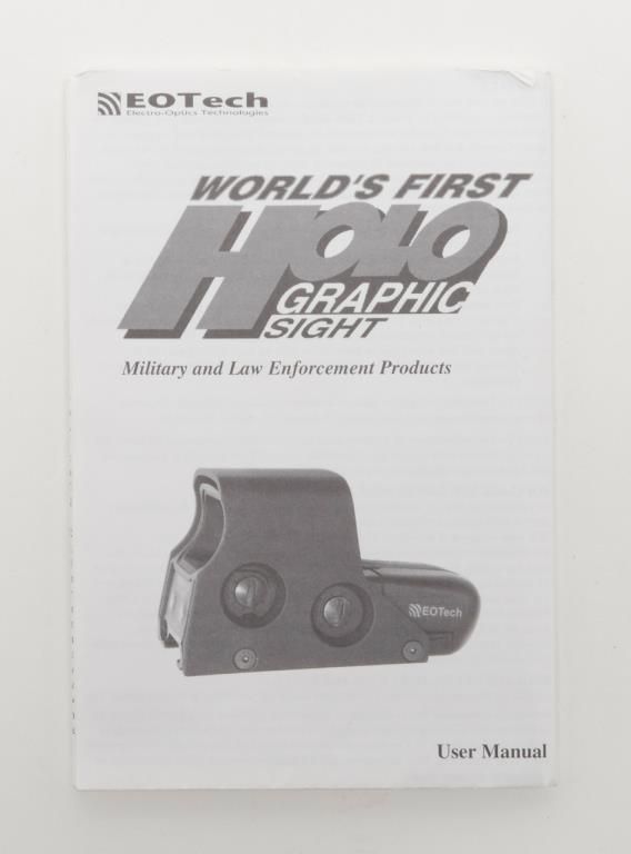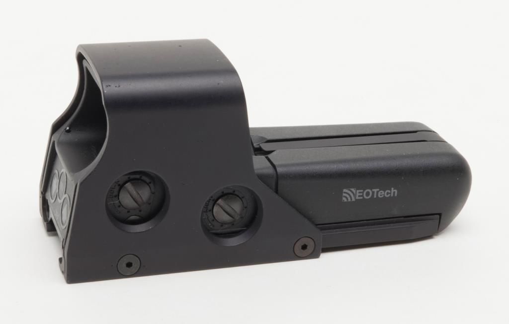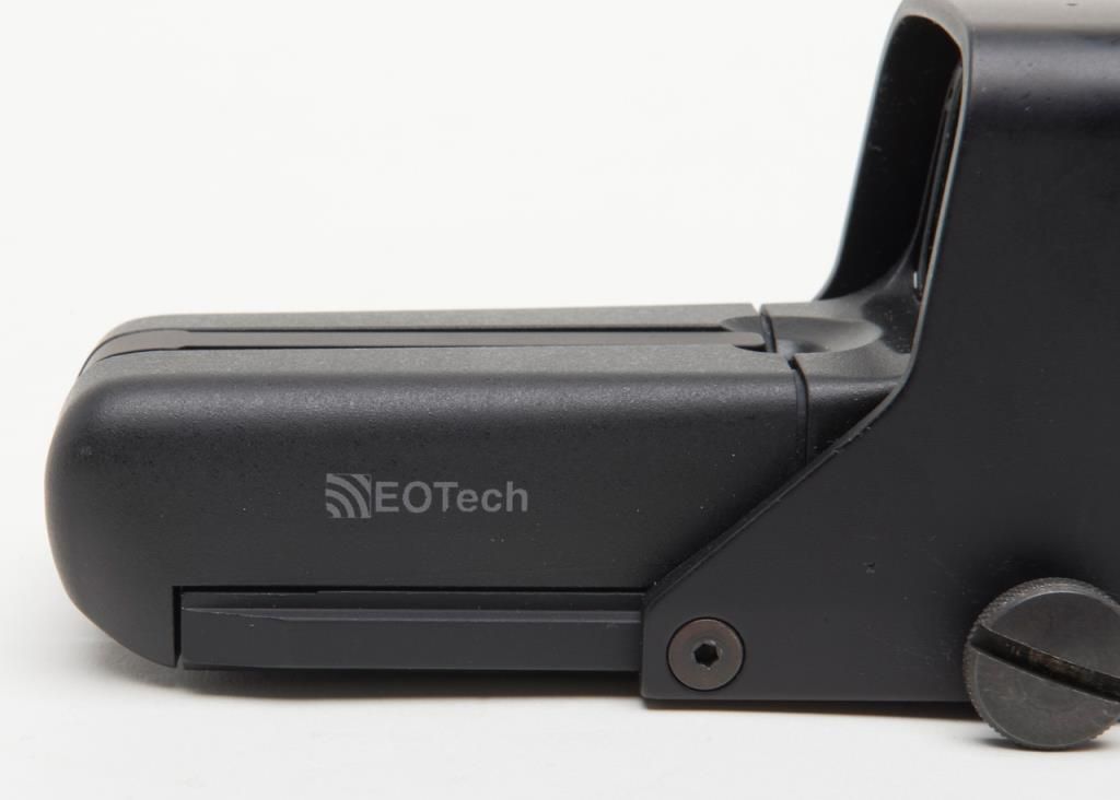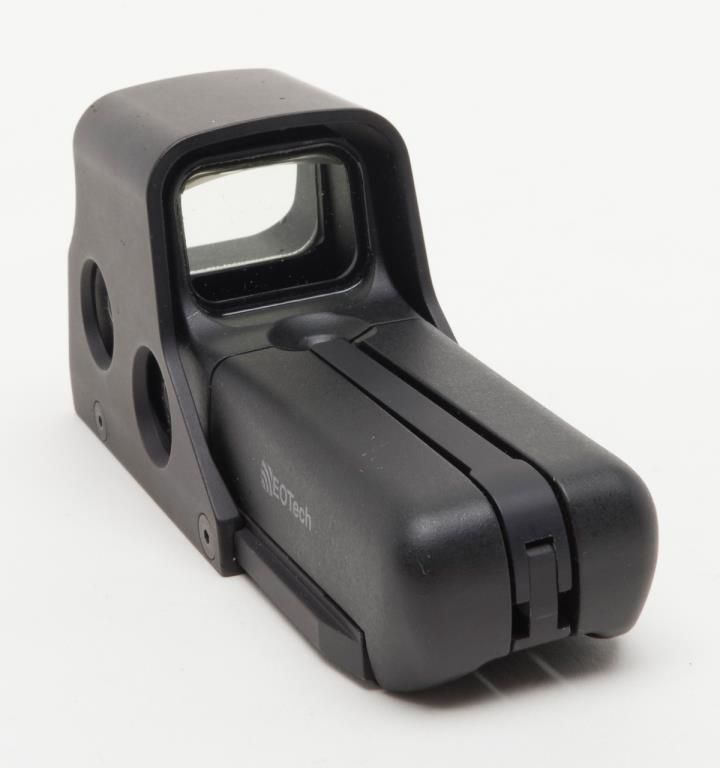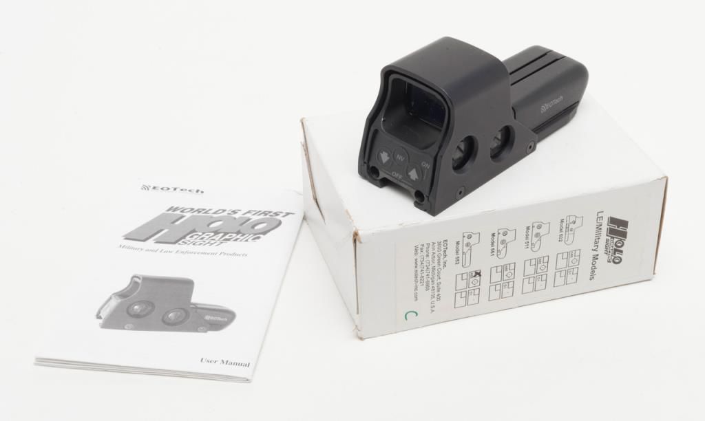 Eotech Model 552 Holographic Sight in original box. A Holographic Display Sight (HDS), the Eotech uses laser light to illuminate a holographic reticle. This allows the user to target using a “Heads Up” display. Lightly usedin its original box. (Exempt). Est.: $250-$500.