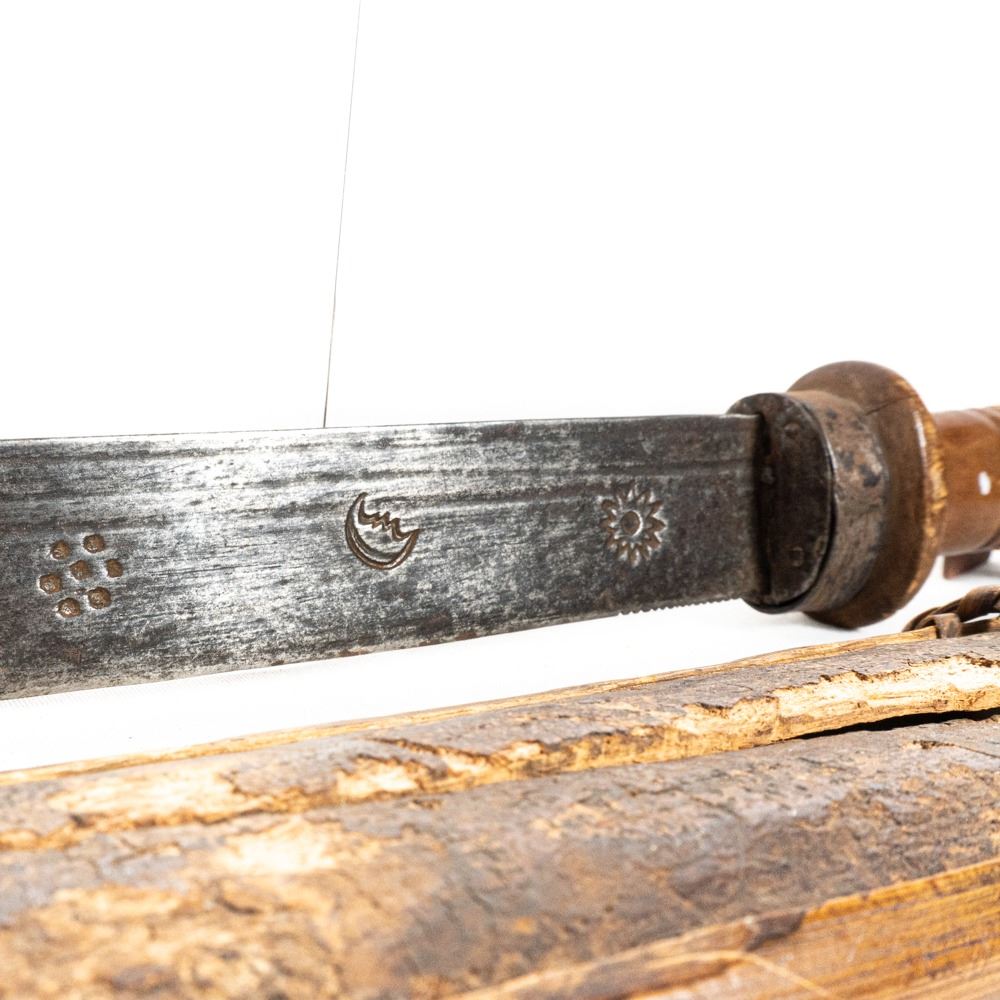 Varnished wooden and metal handle, finely crafted. Blade adorned with talismanic markings. Scabbard made of tree bark with braided rattan bindings.