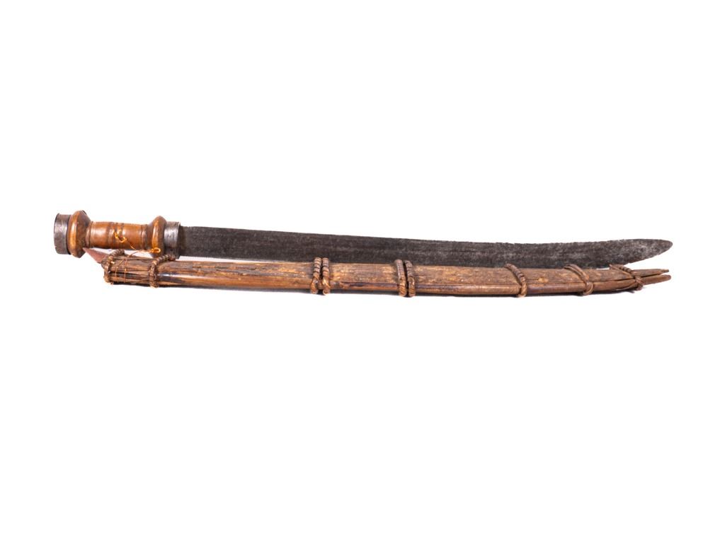 PoignEe en bois verni et mEtal, finement ouvragEe. Lame ornEe de marques talismaniques. Fourreau en Ecorce de bois avec jonc tressE