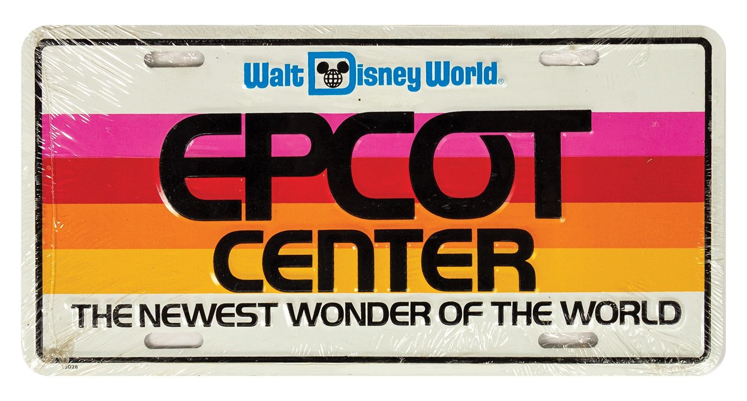 (Epcot, 1982) A vintage stamped metal Walt Disney World Epcot Center license plate featuring the grand opening tag line, “The Newest Wonder of the World.” The souvenir license plate is still sealed in its original plastic wrapping and retains the park price tag sticker on the reverse. Measuring 6”x12”, the piece remains in very fine as-new condition.