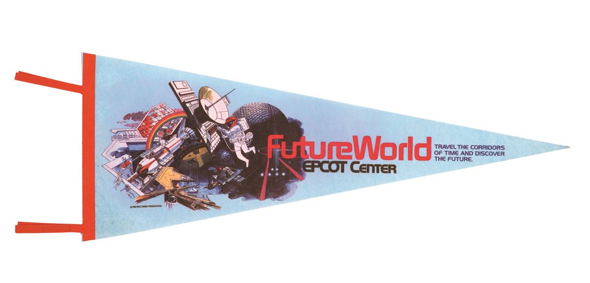 (EPCOT, 1982) A light blue felt pennant for Future World at the EPCOT Center in 1982. The tagline reads, "Travel the Corridors of Time and Discover the Future". Measures 11.25"x29.5". In good condition with some edge-wear.