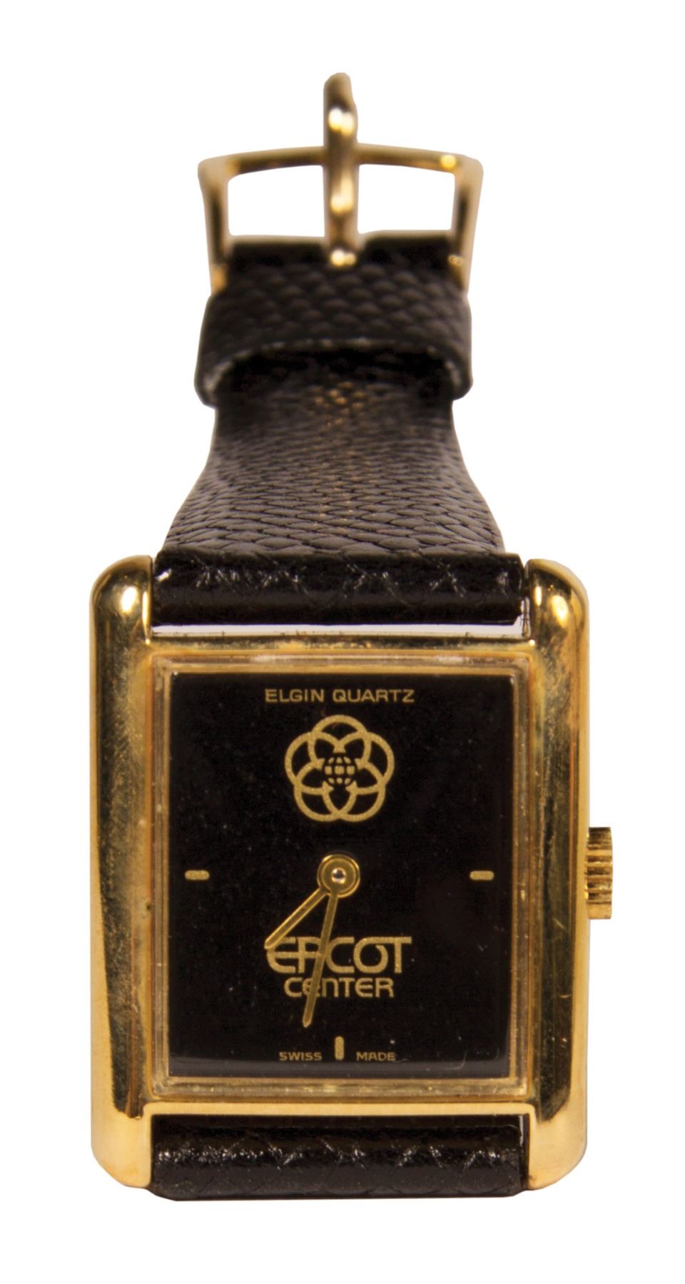 (Epcot, 1982) A rare souvenir Elgin Quartz watch from Epcot Center's opening year. Featuring Epcot's "5 Rings" logo, the watch has a stainless-steel back, base metal bezel, and genuine leather band. The watch is unused and comes in its original display box. Measuring 8.25" long, the watch is in very fine condition, and needs a replacement battery.