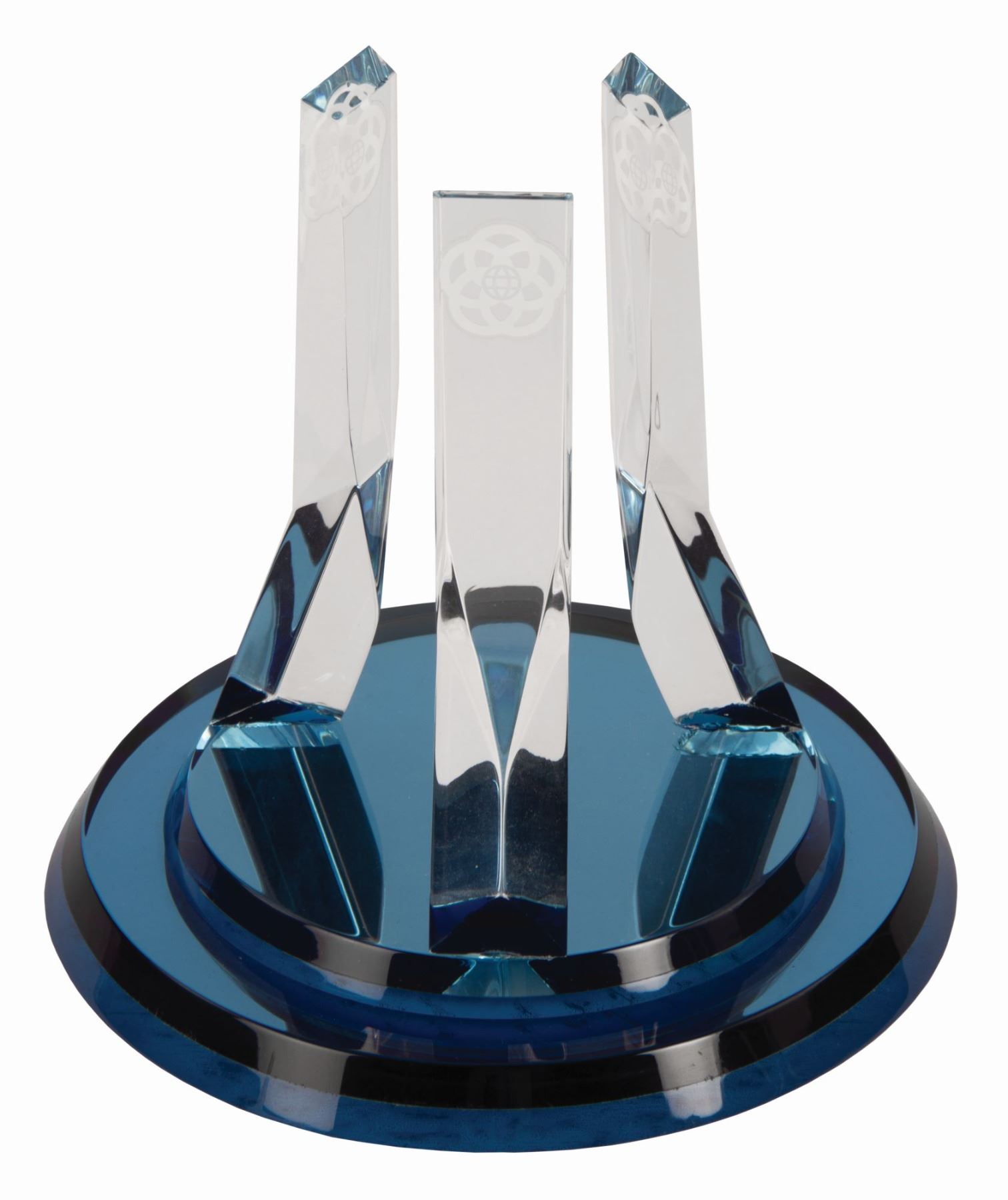 (Epcot, 1982) A small replica of the prism sculpture seen in front of Epcot's Spaceship Earth. Created in plastic over a blue mirrored base, the replica measures approximately 7" tall and is in very good condition.