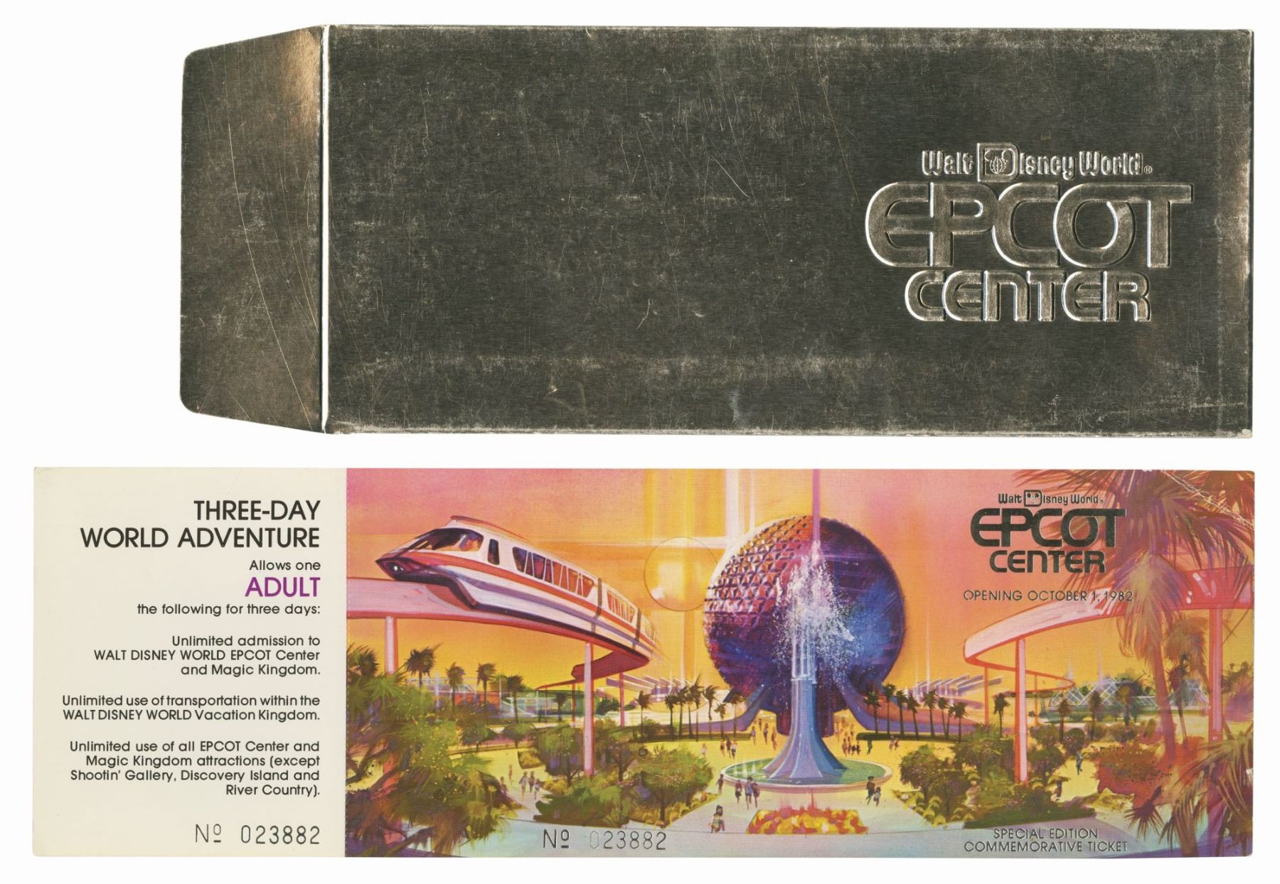 (Epcot, 1981) A rare special edition commemorative ticket created prior to the grand opening of Epcot on October 1st, 1982. An accompanying voucher would be redeemed at a ticket booth following the grand opening in exchange for admission. This ticket includes a sleek metallic ticket envelope that is embossed, "Walt Disney World EPCOT Center." The ticket measures 3.75"x11.75" and is in good condition with minor edge-wear and some creasing to the top-right corner. The ticket is numbered 023882.